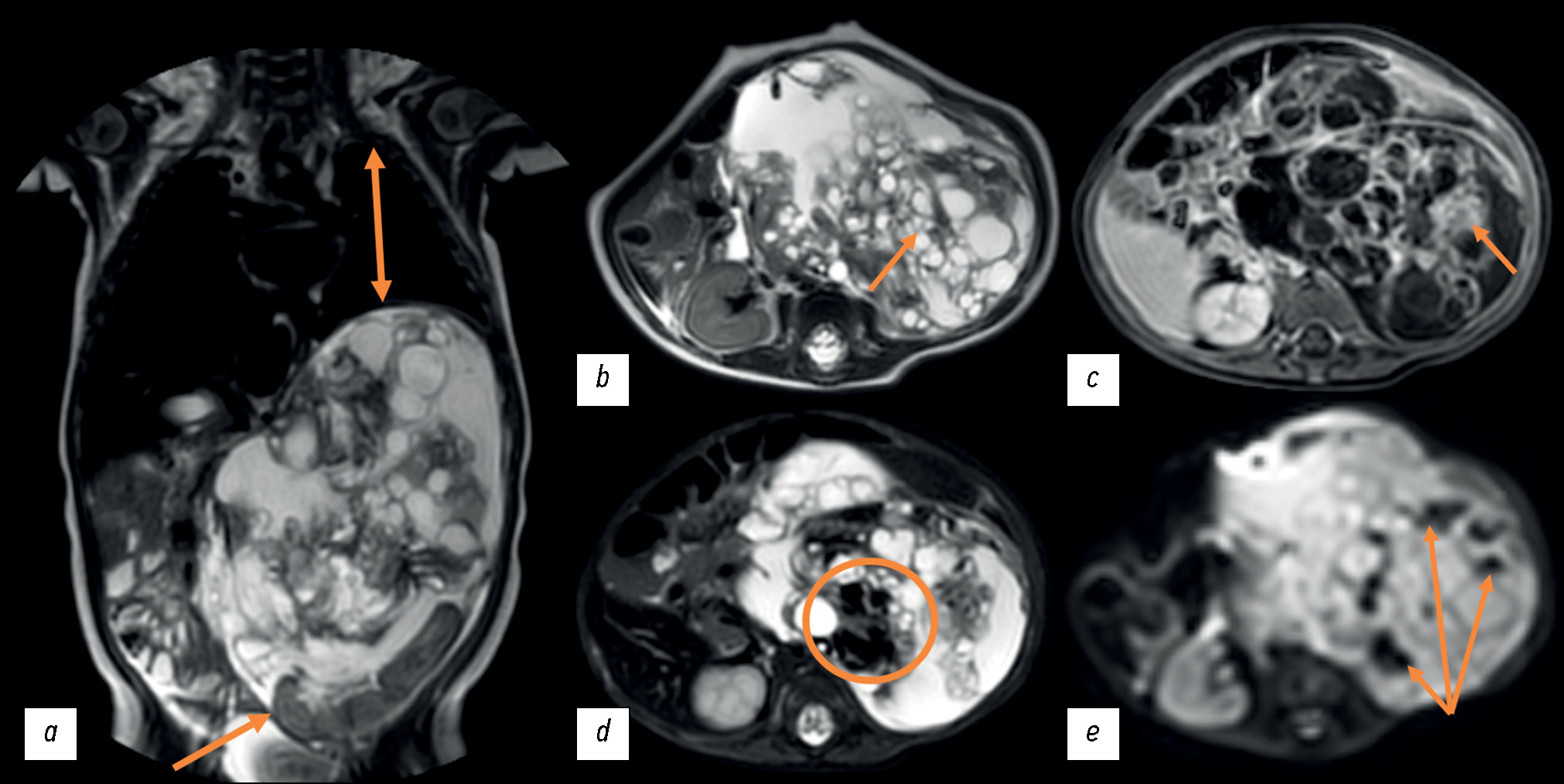 Fig. 4. Contrast-enhanced abdominal magnetic resonance imaging dated November 11, 2020, coronal (a) and axial (b–e) planes: (a) Т2-weighted image; diminished volume of the left lung caused by the tumor pressing on the left hemidiaphragm (double orange arrow), displacement of the left kidney to the pelvic area (orange arrow); (b) Т2-weighted image; multiple cysts in the tumor (orange arrow); (c) Т1-weighted image +С; focal contrast uptake in solid components (orange arrow); (d) T2 SPIR; signal dropout because of fat deposits in the tumor (orange circle); (e) diffusion-weighted image; restricted diffusion areas due to intratumor hemorrhages (orange arrows).
