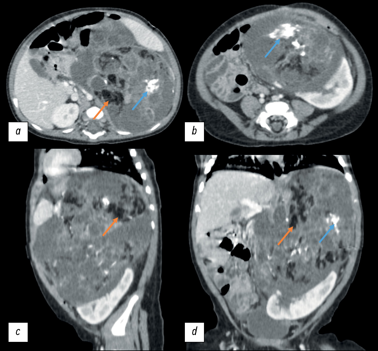 Fig. 5. Contrast-enhanced abdominal computed tomography dated November 1, 2020: (a, b) axial plane; (c) sagittal plane; (d) coronal plane. Orange arrows indicate the hypodense areas (fat deposits) of the tumor, with a density of –80 HU; blue arrows indicate calcification.