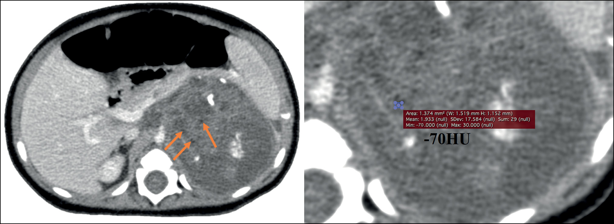 This case report underscores the need to thoroughly examine the tumor node structure and assess the density of different tumor components. The retrospective examination of the diagnostic errors revealed that teratoma could have been suspected as early as the initial abdominal MSCT, as the presence of small hypodense inclusions (–70 HU) consistent with the lipid component of the tumor and uncharacteristic of neuroblastoma should have been considered (Fig. 6).