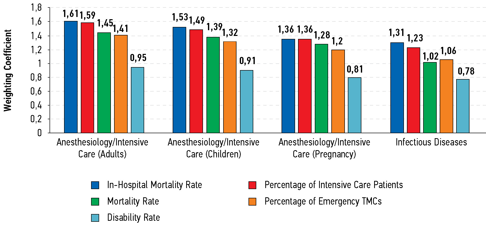 The highest weighting coefficients for all five subgroups were found in four treatment areas such as Anesthesiology/Intensive Care (Adults), Anesthesiology/Intensive Care (Children), Anesthesiology/Intensive Care (Pregnancy), and Infectious Diseases (Fig. 1). In these treatment areas, the in-hospital mortality rate and the percentage of intensive care consultations were the most significant parameters. Less significant parameters for Intensive Care included the mortality rate and the percentage of emergency TMCs, and vice versa for Infectious Diseases. The disability parameters were the least significant.