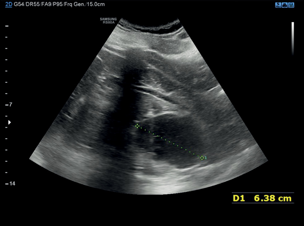 Рис. 1. При ультразвуковом исследовании выявлено неоднородное образование больших размеров, преимущественно анэхогенное, с округлыми чёткими границами, расположенное в средне-нижней части левой почки. Наибольший диаметр составил 6,38 см.