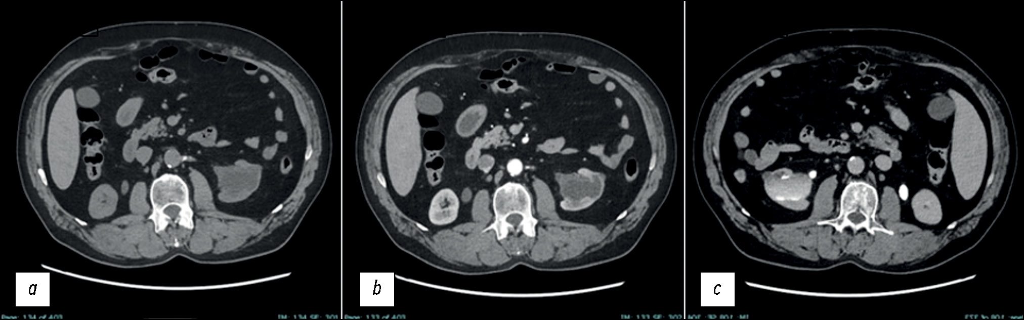 Рис. 2. Аксиальные срезы, результаты компьютерной томографической урографии: a — без контрастирования, при сканировании признаки литиаза в обеих почках отсутствовали, образование в левой почке было гиподенсным с томографической плотностью, соответствующей жидкости (в единицах Хаунсфилда); b — в артериальной фазе, при сканировании было отмечено незначительное увеличение плотности кистоподобной полости; c — в экскреторной фазе, при сканировании наблюдалось контрастное усиление стенок полости, с постепенным заполнением полости контрастным веществом.