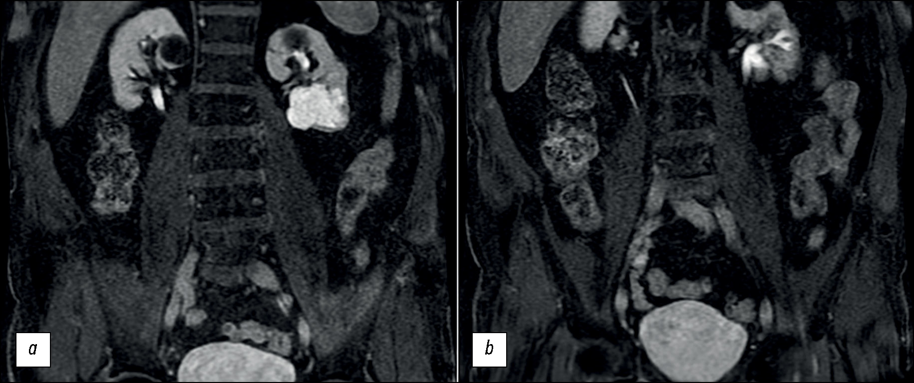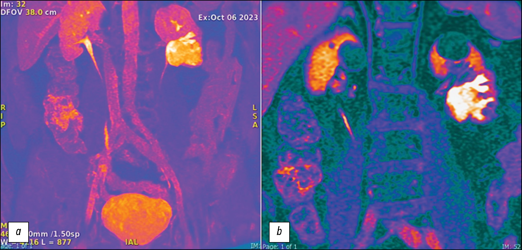 МР-урография позволяет лучше охарактеризовать рассматриваемые образования. При простой кисте визуализируются ровные края и чёткая граница с почечной паренхимой, а также присутствует однородный гиперинтенсивный сигнал в Т2-режиме. Кроме того, МРТ обладает высокой чувствительностью с точки зрения выявления внутренних перегородок, утолщения и узловых образований, которые обычно присутствуют при кистозном почечно-клеточном раке. Дивертикул чашечки легко идентифицируется с помощью МРТ ввиду наличия интенсивного сигнала как от полости, так и от воронкообразного канала в Т2-режиме [4, 7].