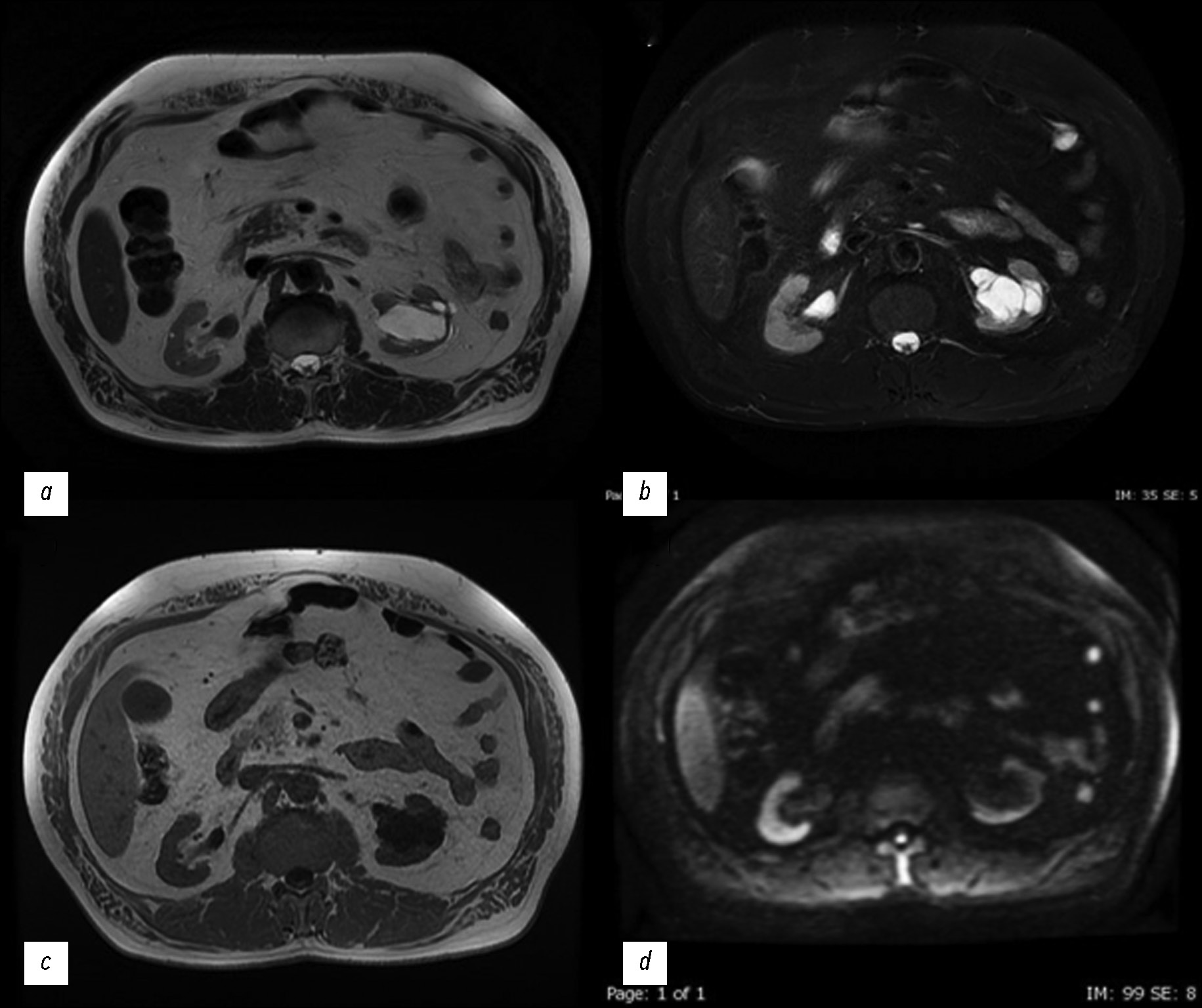 Рис. 4. Магнитно-резонансная урография, аксиальные срезы: a — на Т2-взвешенном изображении визуализируется гиперинтенсивное образование; b — на T1-взвешенном изображении в режиме жироподавления после введения контрастного вещества в отсроченной фазе визуализируются гиперинтенсивные образование и почечная лоханка; c — на синфазном изображении образование и выделительная система визуализируются с той же интенсивностью; d — на диффузионно-взвешенном изображении при высоком b-значении ограничение диффузии отсутствует.