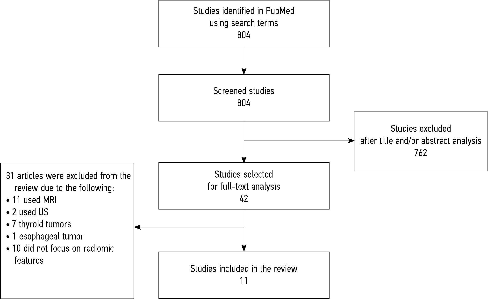 The initial search identified 804 publications. After reviewing the titles and abstracts, 762 publications were excluded as irrelevant (other types of cancer were investigated, radiomics analysis was not used, etc.). Forty-two publications were included for analysis after reviewing the titles and abstracts (Fig. 1). Of these, 11 studies were included in the final analysis, whereas 31 were excluded (11 studies used magnetic resonance imaging, 2 used ultrasound examination, 7 focused on thyroid cancer, 1 focused on esophageal cancer, and 10 did not specify the radiomic parameters used).
