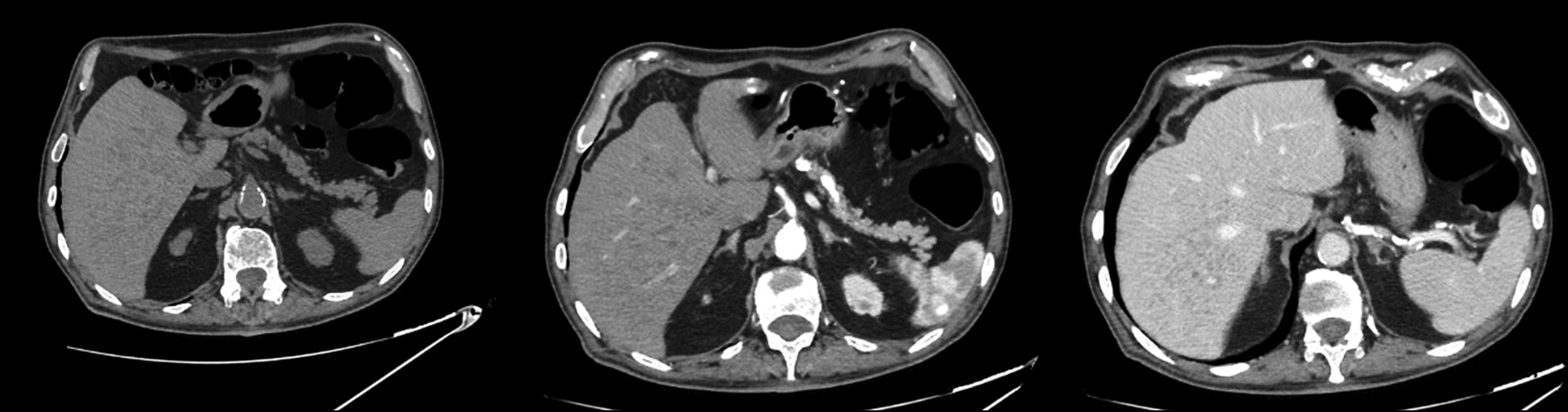 An 82-year-old male presented to the hospital with a primary complaint of abdominal pain persisting for more than 6 weeks. The patient has no personal/family history significant for liver disease. A thorough medical evaluation, including physical examination and blood tests, was conducted. However, these initial assessments did not yield conclusive results nor provide a clear diagnosis.