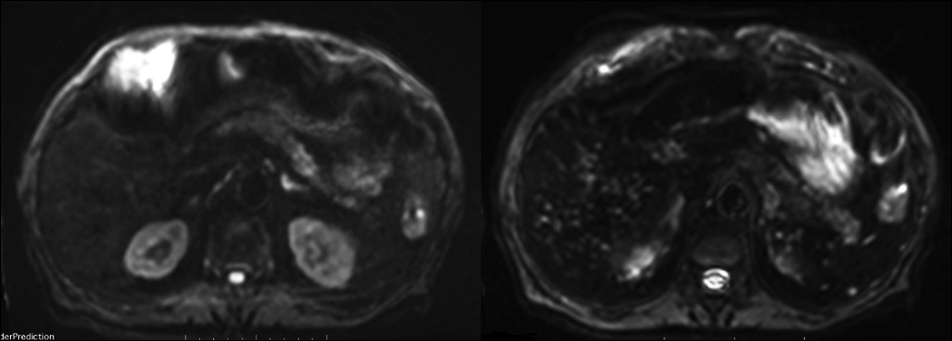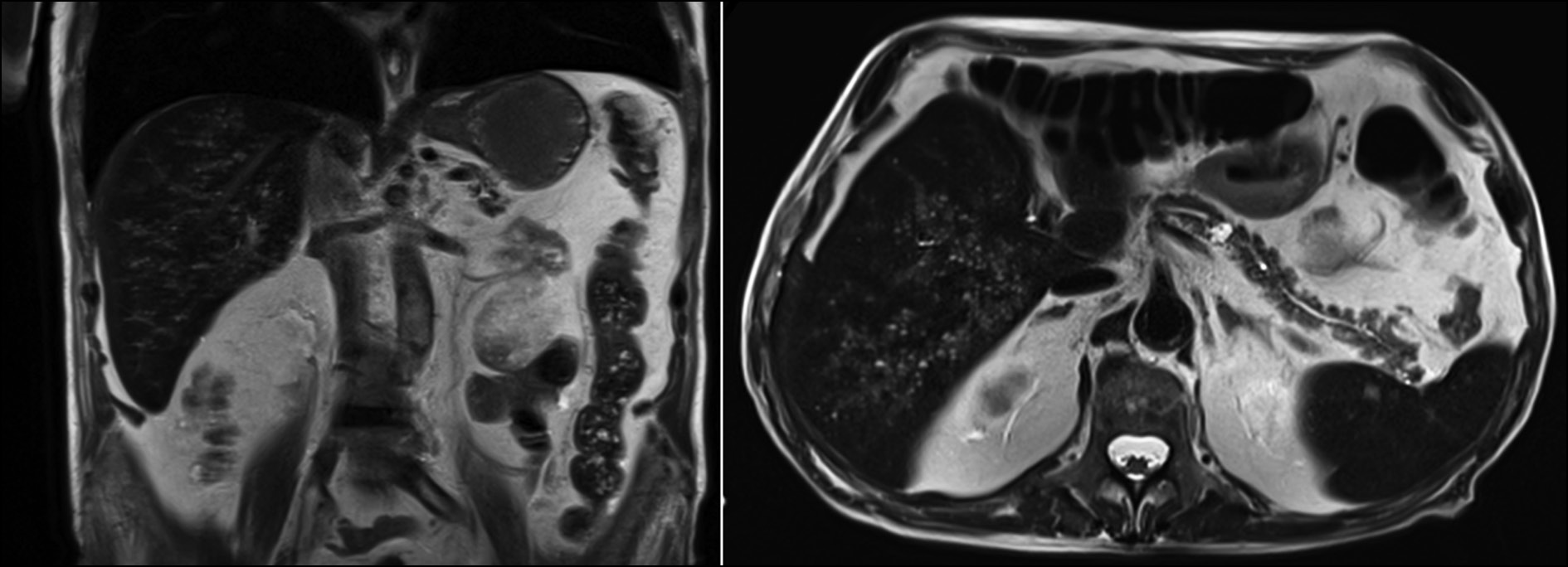 Fig. 2. Coronal and axial MRI images with HASTE T2 sequence: multiple small hyperintense lesions throughout the hepatic area.