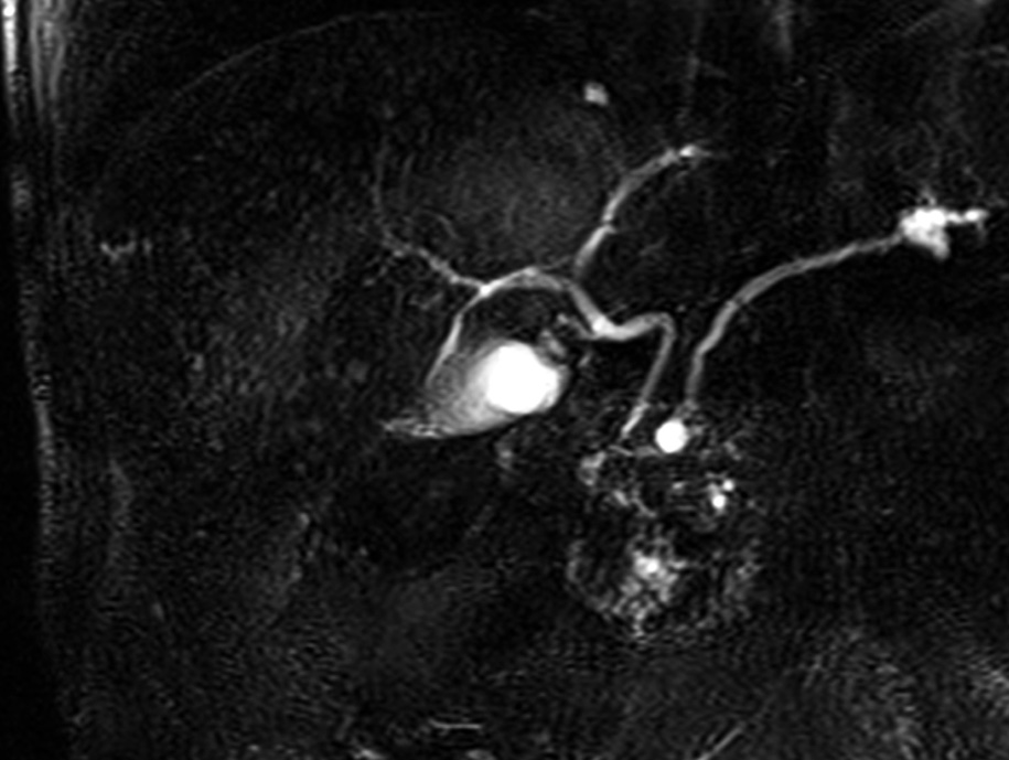 In T2-weighted MRI–cholangiography sequences, the liver presents a “starry sky” appearance due to the presence of multiple small hyperintense lesions; however, the communication with the bile duct are usually not recognized [7] (Fig. 4).