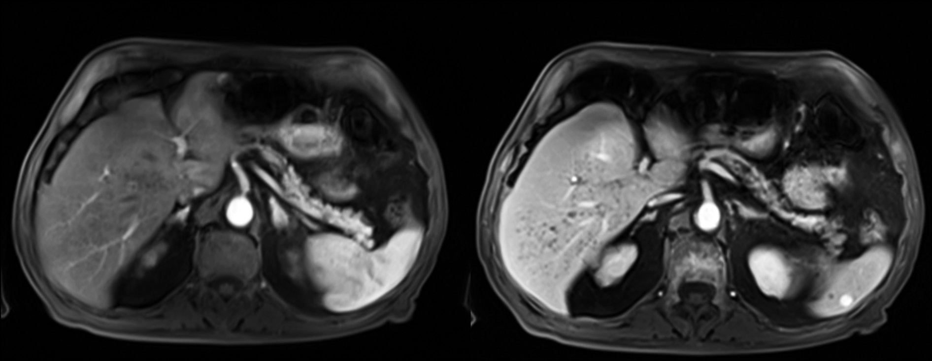 The patient presented at the hospital for a computed tomography scan and an abdominal magnetic resonance imaging recommended by his general practitioner to assess the biliary tree (magnetic resonance cholangiopancreatography), owing to persistent abdominal pain. The patient had never undergone an abdominal magnetic resonance imaging previously; hence, the discovery of hepatic lesions was incidental and unexpected.