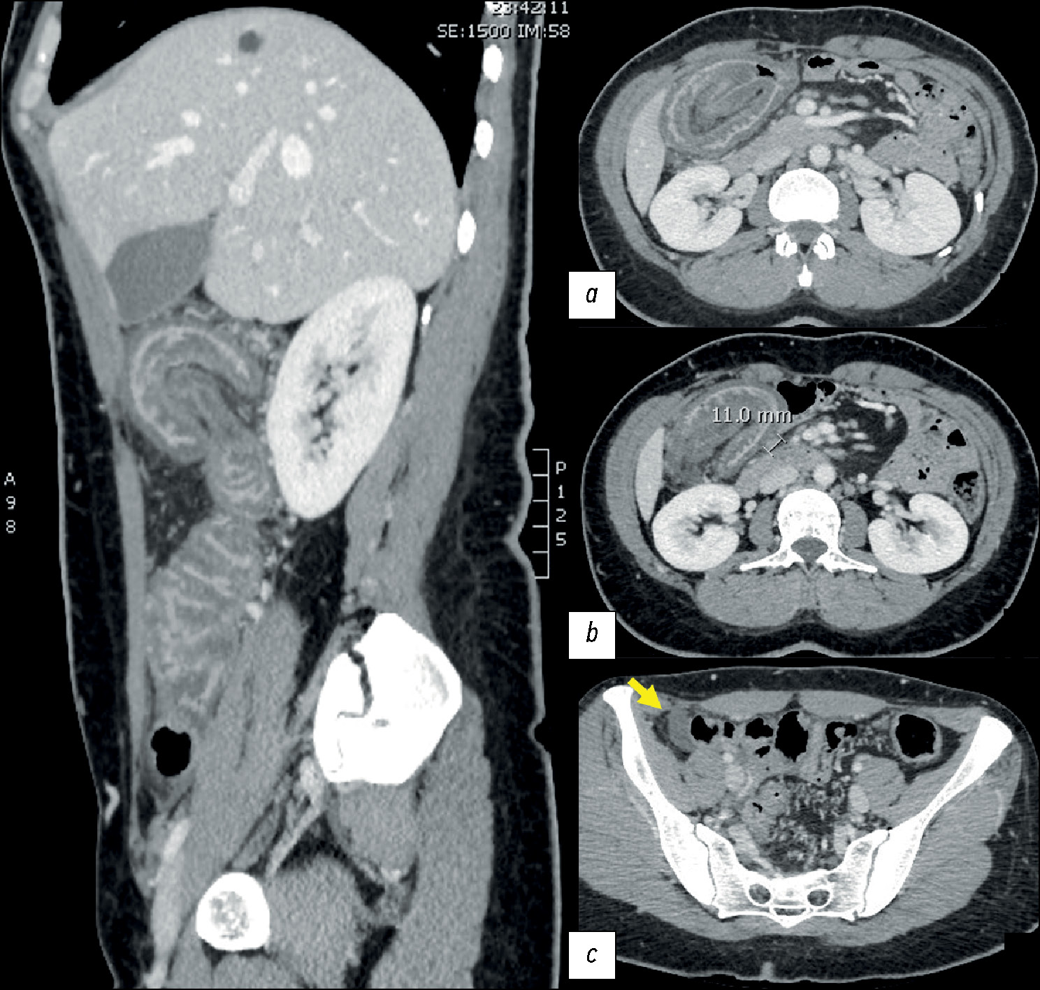 Fig. 1. Abdominal computed tomography, portal phase. Sagittal multiplanar reconstruction: (a) enterocolic invagination with the involvement of the mesenteric fat and vascular structures. Thick edematous walls, stranding of the surrounding fatty tissue (b), and satellite nodes (11 mm in c).