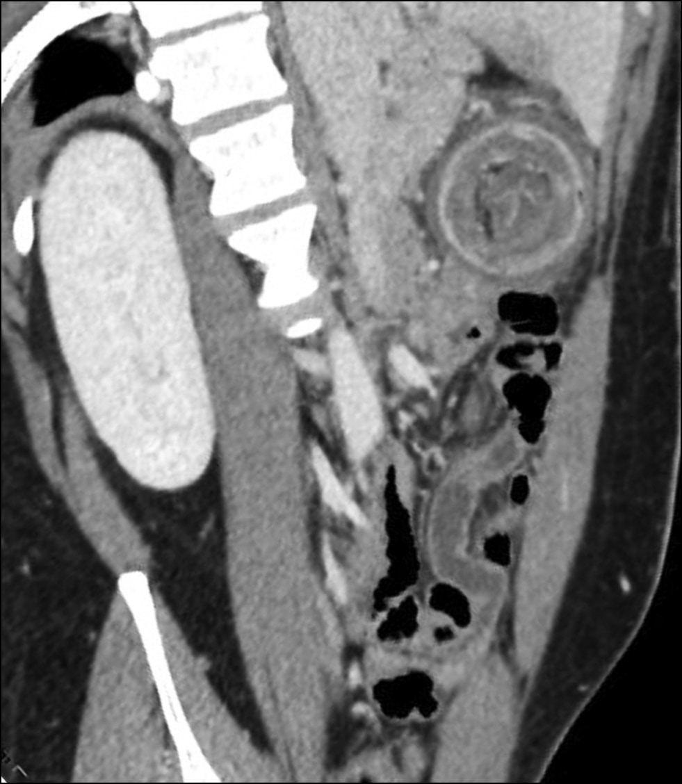Fig. 2. Oblique sagittal multiplanar reconstruction, orthogonal to the intussusception, shows the “target sign” due to the alternating of edematous walls and mesenteric fat.
