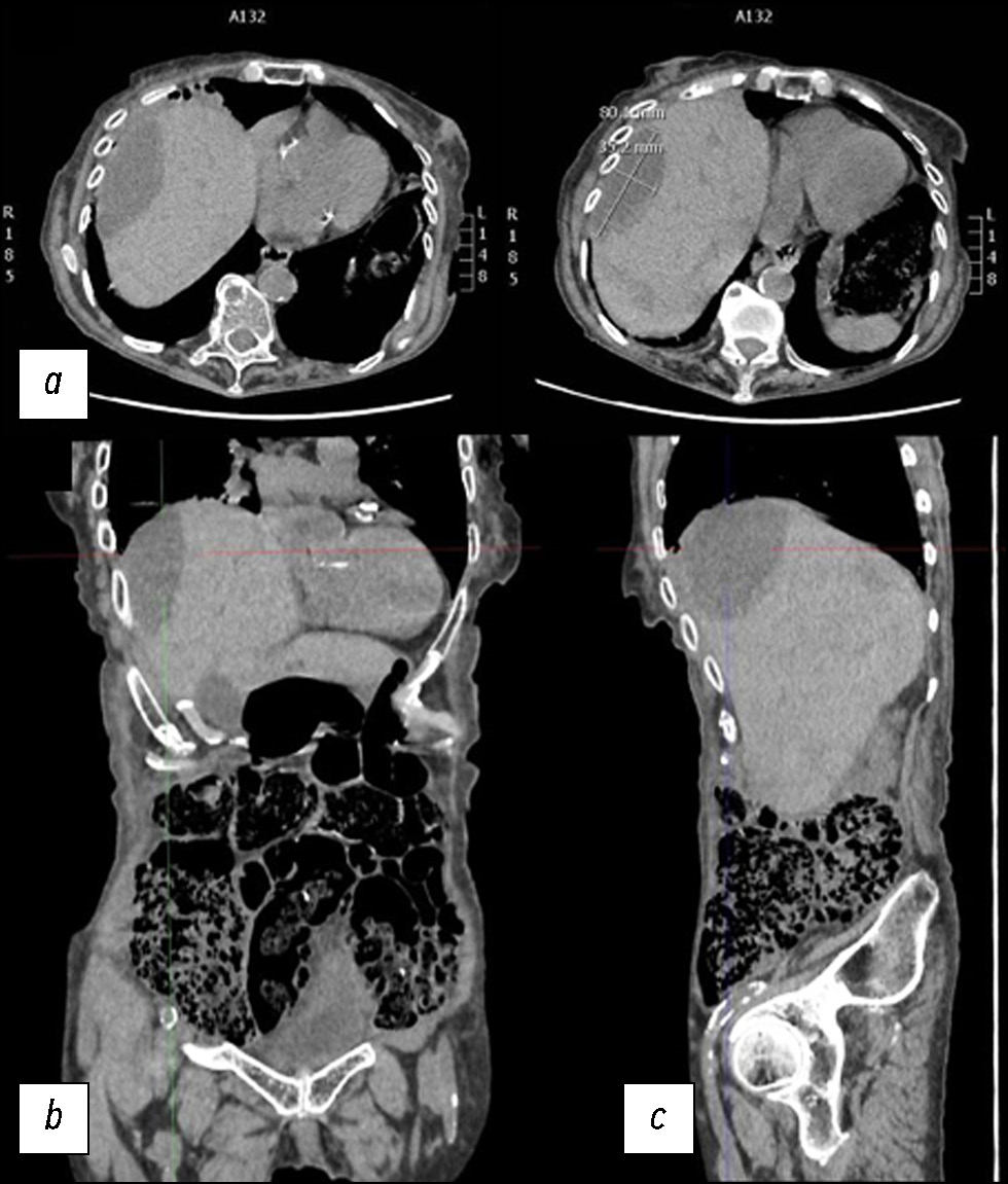 На снимках в аксиальной плоскости сверху (справа, с указанием размеров), в корональной и сагиттальной плоскостях наблюдались неоднородное ослабление сигнала и увеличение печени с гиподенсными овальными образованиями и жидкостью повышенной плотности (25–30 единиц по шкале Хаунсфилда) в субкапсулярной области, самое большое из которых соответствовало VII сегменту печени и имело передне-заднюю ширину 8 см и максимальную толщину 35 мм. В брюшной полости наблюдался сопутствующий выпот.