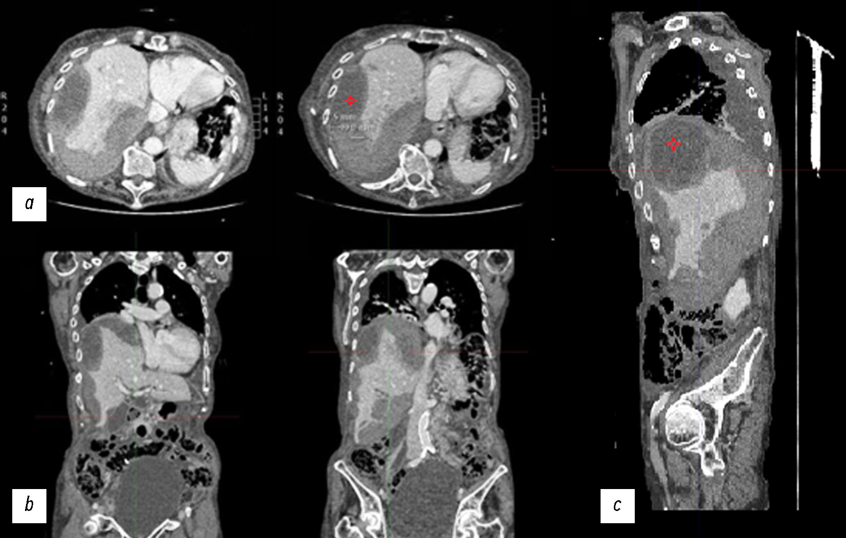 Рис. 2. Снимки компьютерной томографии с контрастным усилением в портально-венозной фазе: a — аксиальная плоскость; b — корональная плоскость; c — сагиттальная плоскость.