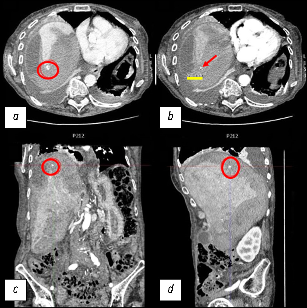 Компьютерную томографию с контрастным усилением в артериальной фазе провели через несколько дней после ангиографии. На контрольном снимке не было рентгенологических признаков, указывающих на активную экстравазацию контрастного вещества в VIII сегменте печени, поскольку в отмеченной красным кругом области в различных плоскостях: аксиальной, корональной и сагиттальной — не было отмечено гиперденсных пятен. Интракапсулярная гематома находилась в стадии разрешения: около 3,5 см, измерено на снимке b и выделено жёлтым цветом, по сравнению с 5 см на предыдущей компьютерной томографии (см. рис. 2).