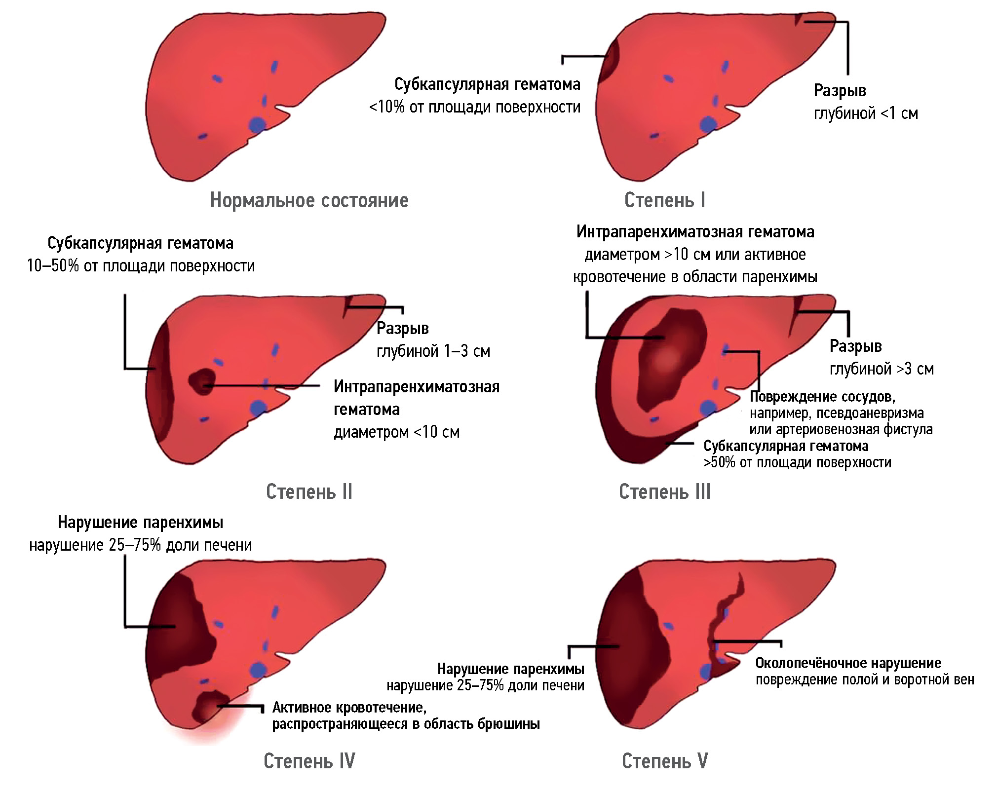 Наиболее популярной системой оценки повреждений печени считается шкала повреждений печени AAST, которая была обновлена в 2018 году. По этой шкале оценивают разрыв паренхимы печени в зависимости от наличия субкапсулярной гематомы, интрапаренхиматозной гематомы и разрывов (рис. 6).