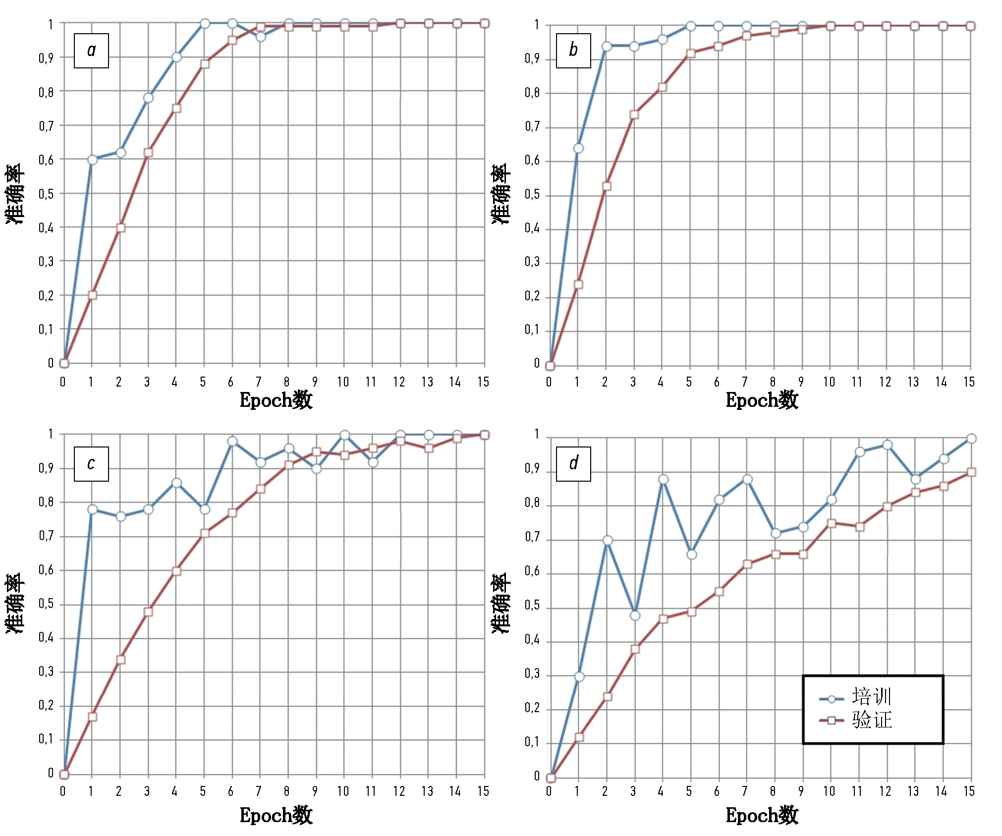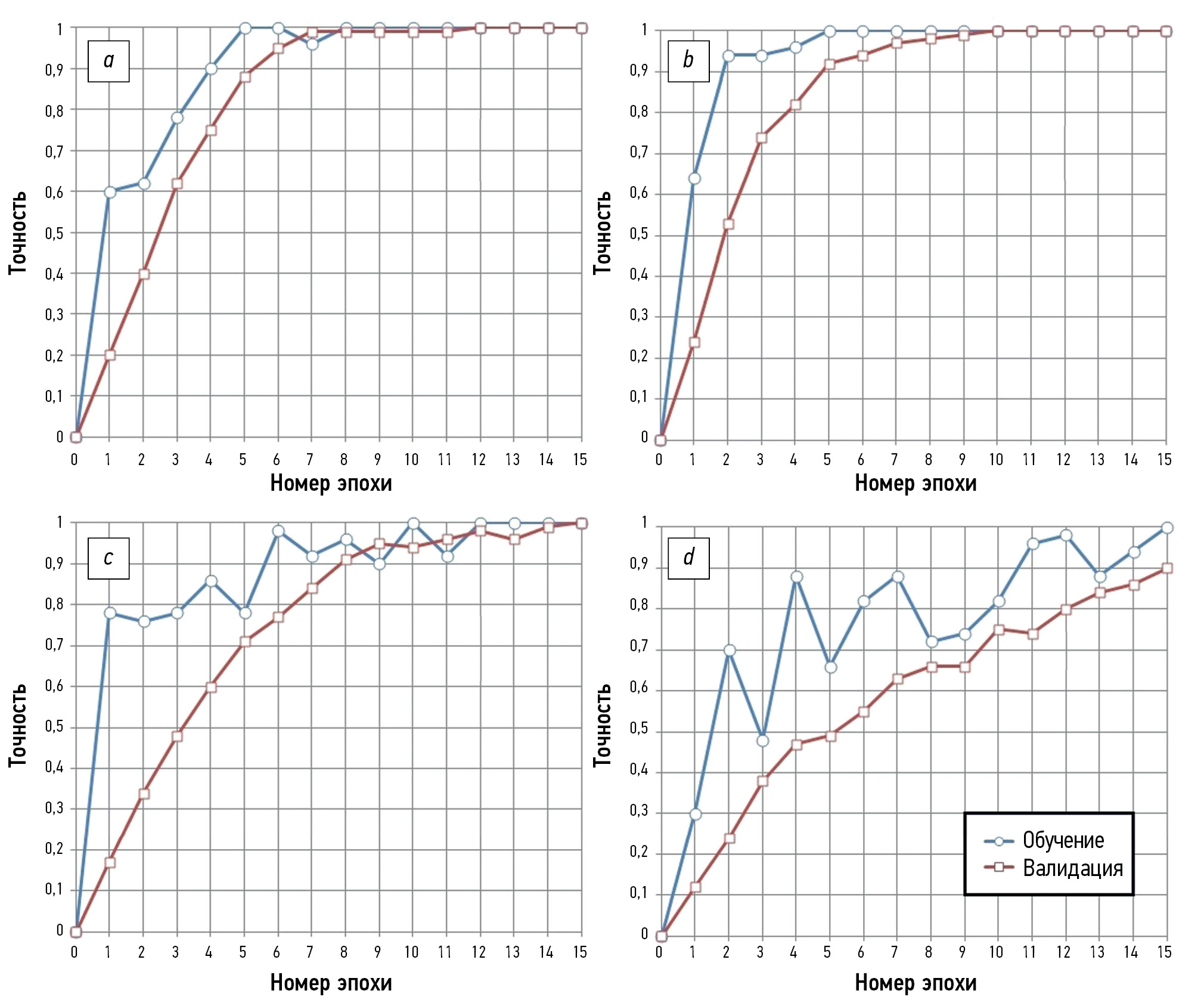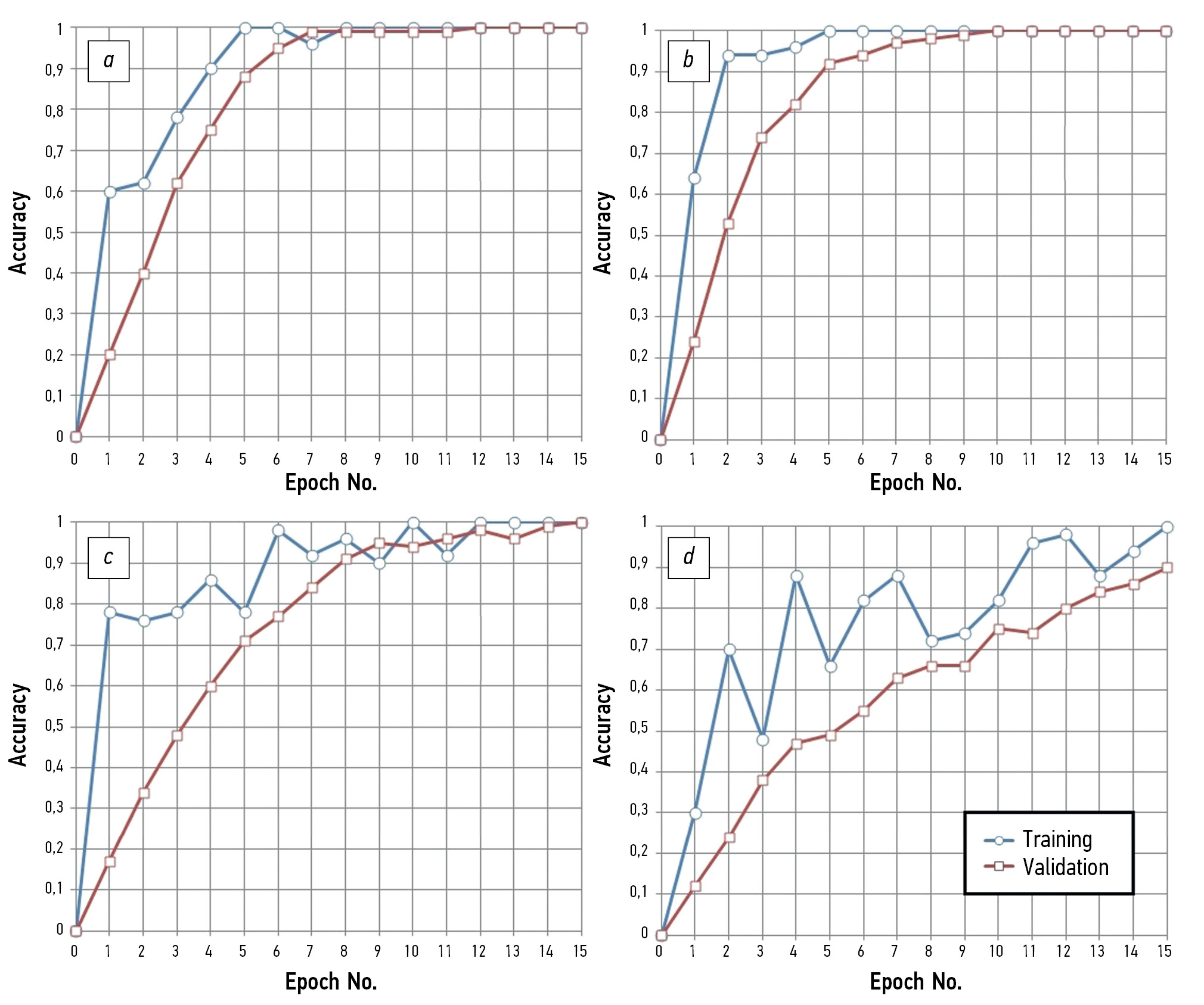 Fig. 1. Training and validation of convolutional neural network models with: a — four, b — five, c — six, and d — seven convolutional layers.