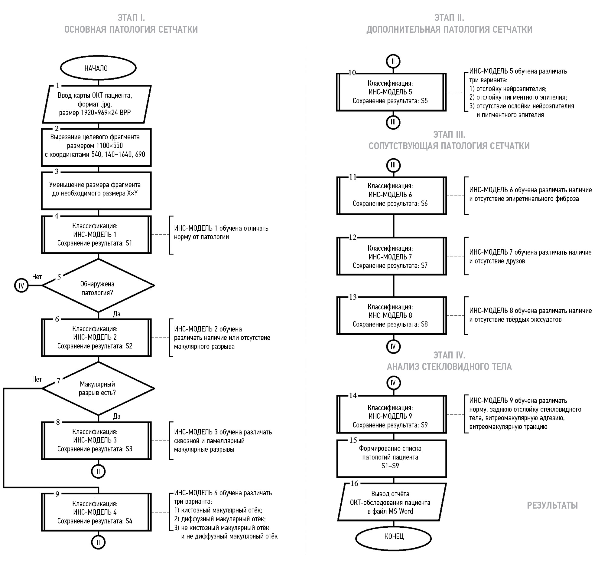 Following the general logic of the study and considering the need to increase the accuracy of additional testing, O. L. Fabrikantov and Ye.V. Kulagina proposed a sequential scheme that usually imitates the process of identifying a retinal OCT image by an ophthalmologist. Accordingly, a computer algorithm was developed (Fig. 3).