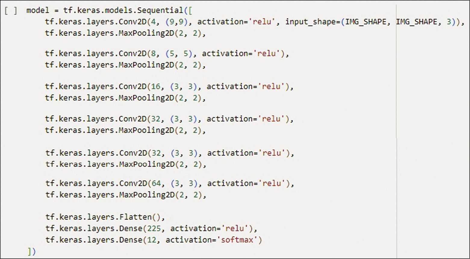 Fig. 2. Architecture and parameters of a six-layer convolutional artificial neural network model: the first number in Conv2D denotes the number of filters to be used in the convolution layer. The next two numbers represent the size (in pixels) of the filters. The activation functions of the network neurons are Relu and Softmax in the output classification layer. The first number in the fully connected Dense layer represents the number of neurons.