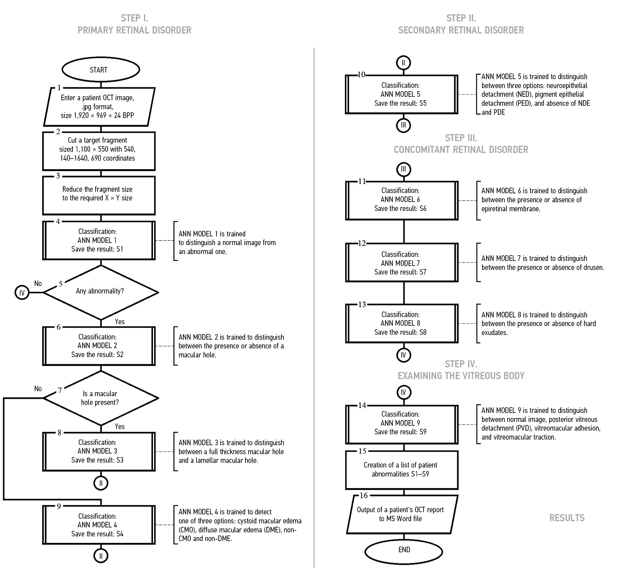 In the described approach, nine different ANN models are used to classify abnormalities in OCT images, each model trained in its unique dataset (1–9). In the final step of examination of the vitreous body, the algorithm described earlier [7] can be used rather than the ANN model 9. It includes:
