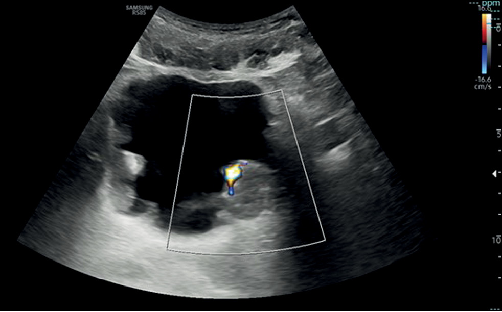 If a focal mass is detected in the US image, the presence of additional lesions must be further explored, considering that one-third of tumors are multifocal, and an additional evaluation with Doppler that helps in identifying the internal vascularity with a rich blood flow signal or a stellate morphology and differentiating a potential tumor from a blood clot. The latter can be excluded by asking the patient to change position from supine to lateral to assess for lesion mobility typical of a clot or performing bladder irrigation, followed by another US scan [11] (Fig.1).