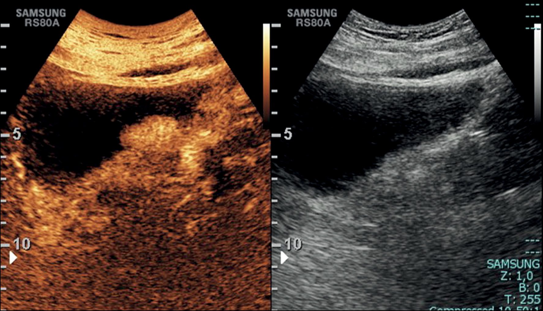 Fig. 2. Sagittal contrast-enhanced ultrasound images showing an enhancing mass of the left bladder wall, not well definable in the B-mode as noticed on the left side of the image.