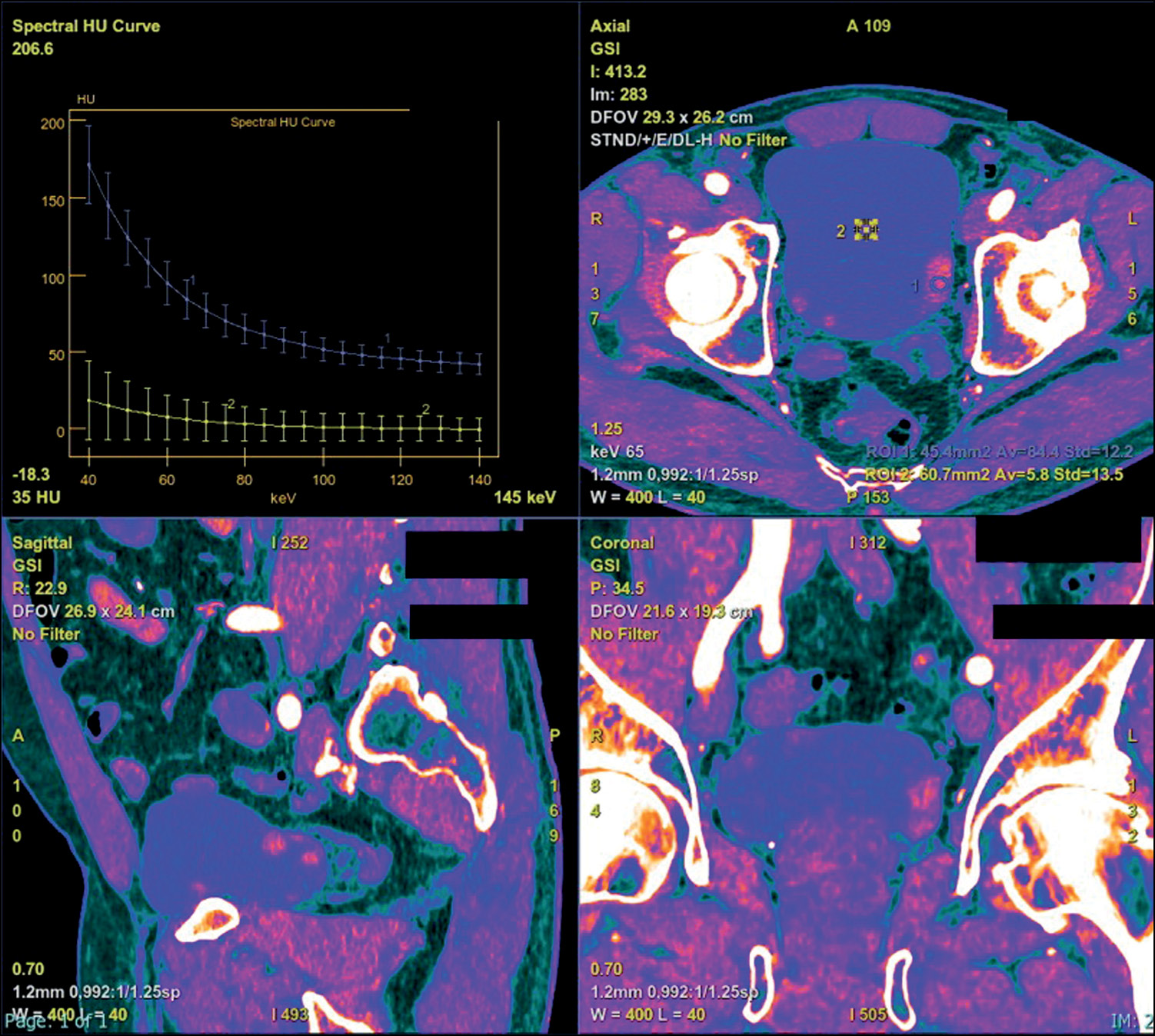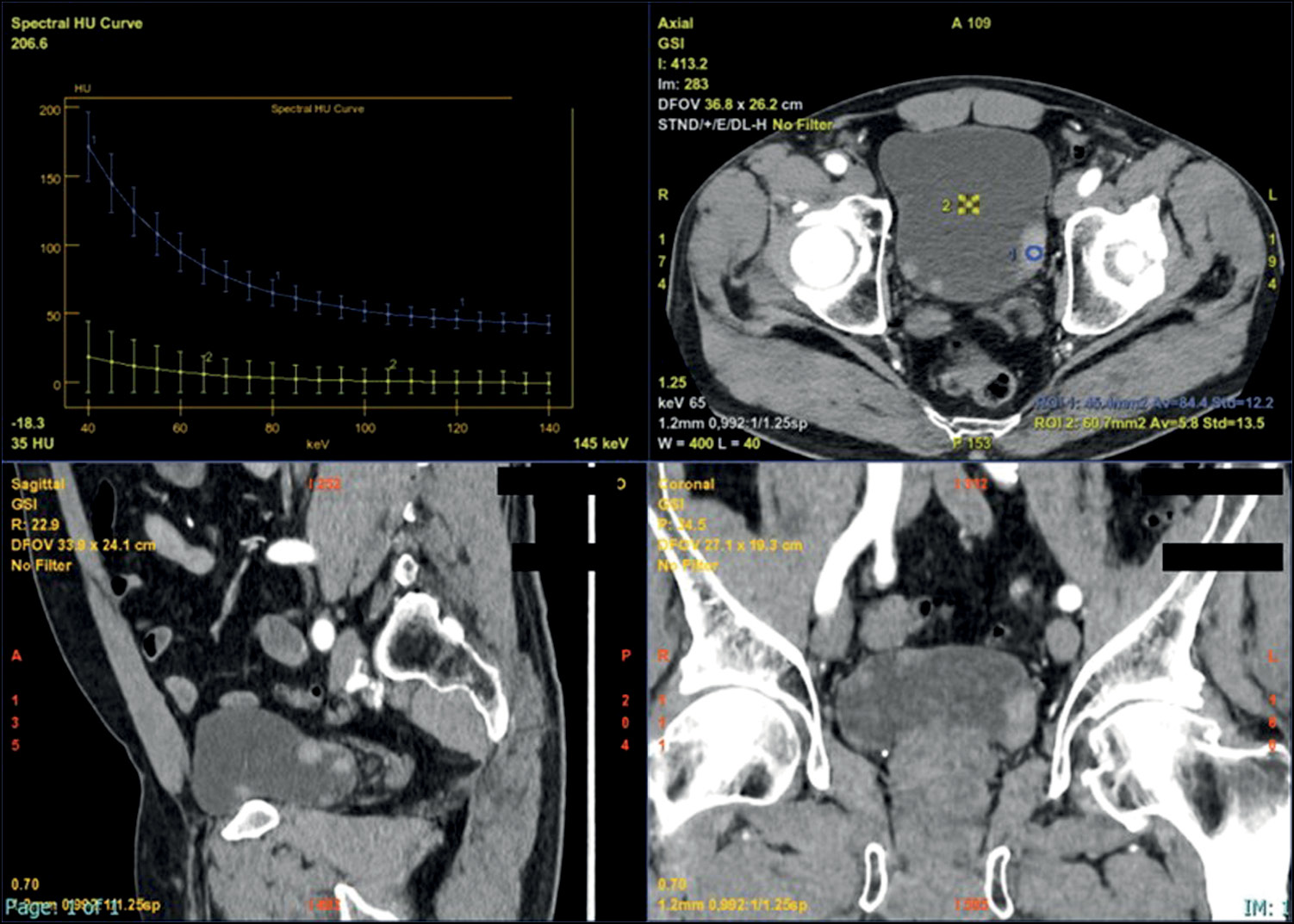Fig. 3. Multiplanar iodine map images showing different attenuations of multifocal masses, the main localized on the left posterior wall, with different Av values compared with the Av endoluminal value. The spectral curve (upper left side) allowed the characterization of materials because each material has a different attenuation curve.