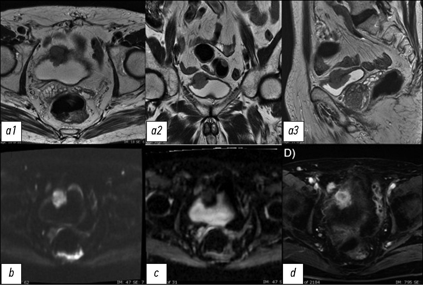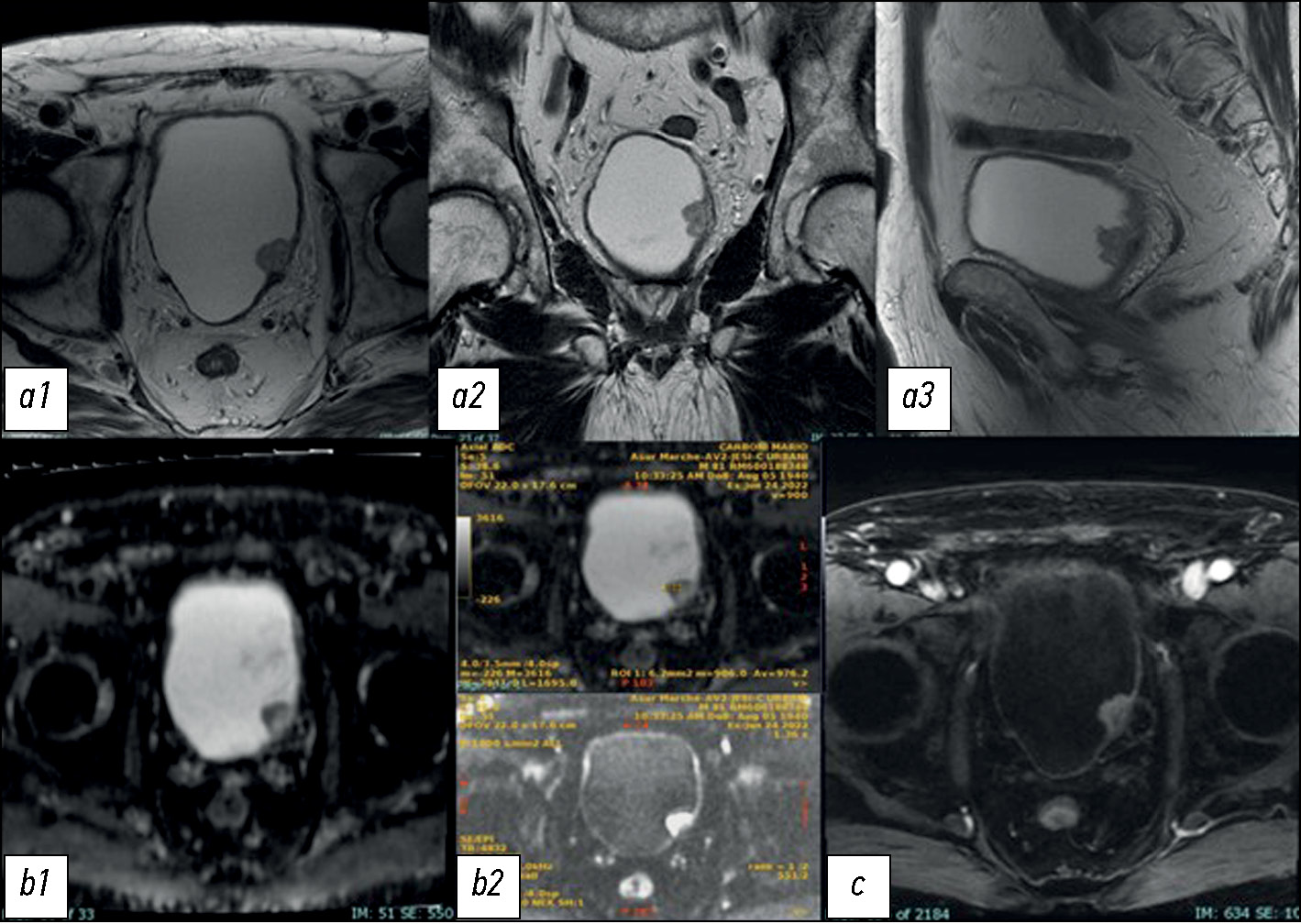 Generally, using a 1.5-T MRI scanner, the examination is performed with the patient in a supine position, and sequences necessary for a proper bladder evaluation are as follows: T1-weighted (T1W) fast spin echo on the axial plane; T2W sequences with high resolution and narrow field of view on axial, sagittal, or coronal plane and with fat suppression; diffusion-weighted imaging (DWI) and apparent diffusion coefficient (ADC); and finally, DCE-MRI with T1W 3D gradient echo and the Dixon three-point method.