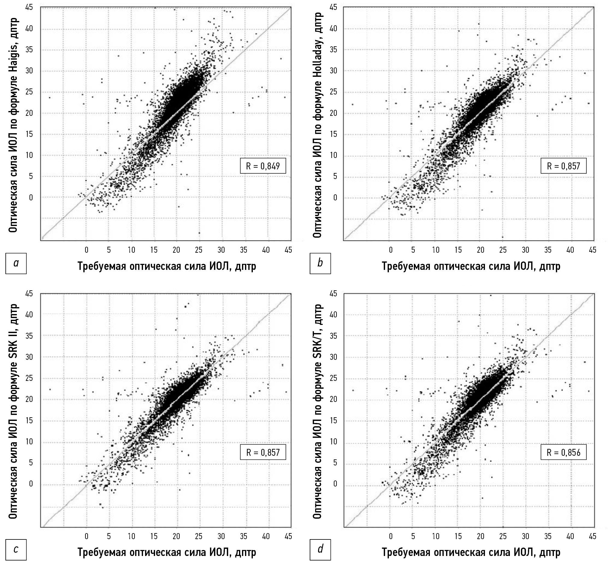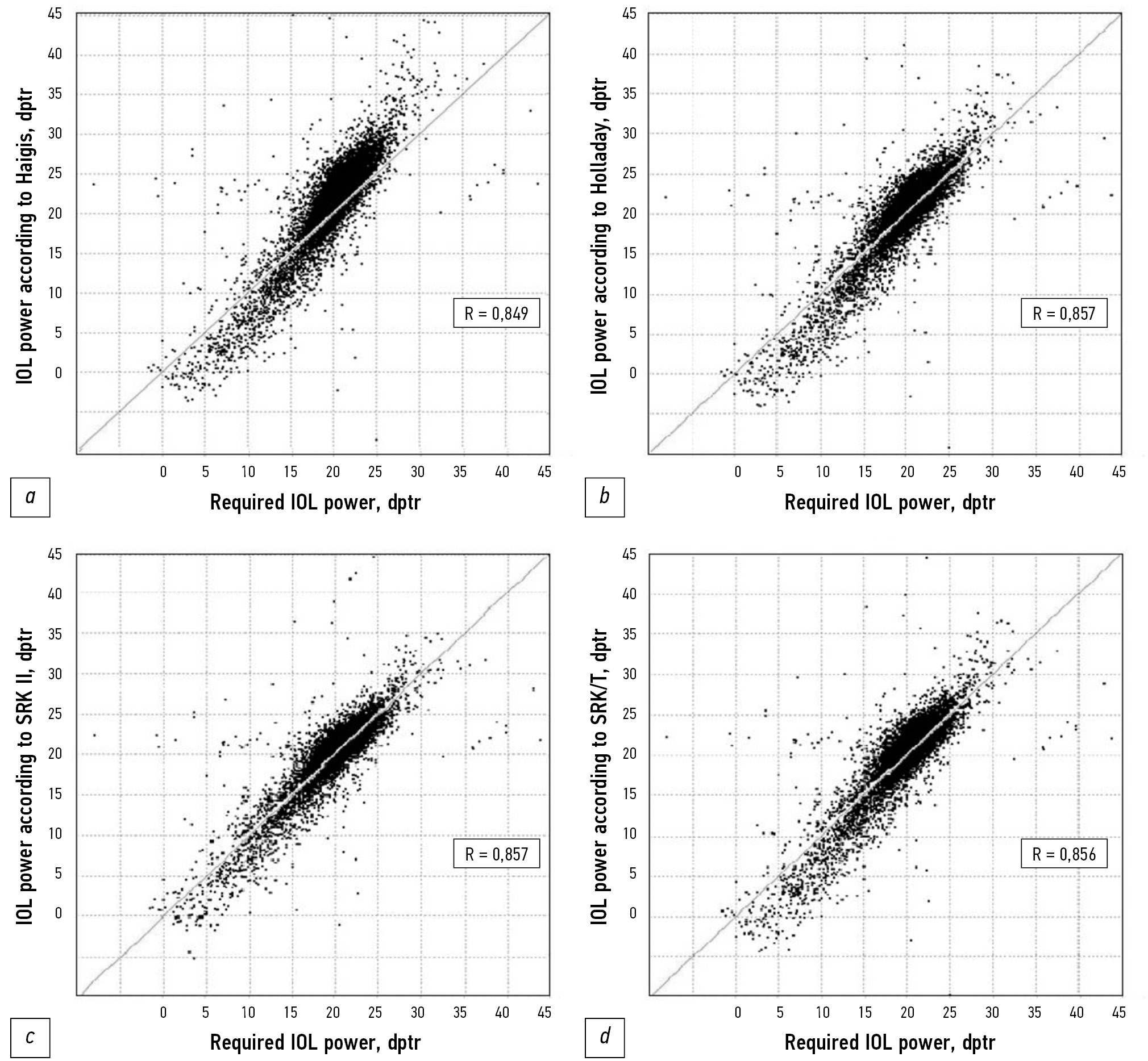 Fig. 1. Correlation dependence of the required optical IOL power along the horizontal axis and the calculated optical IOL power along the vertical axis according to the formulas: a) Haigis, b) Holladay, c) SRK II, and d) SRK/T for 11,701 patients. The correlation coefficients are shown in the graphs.