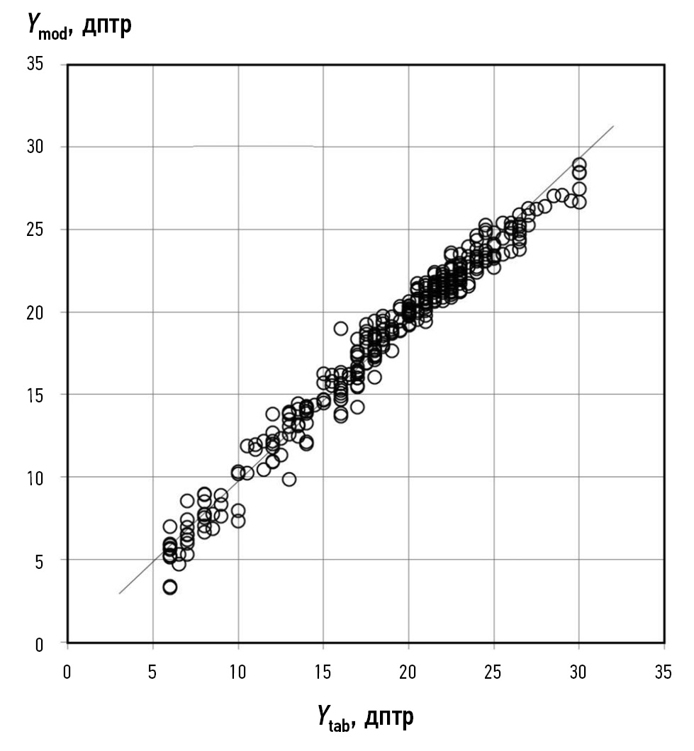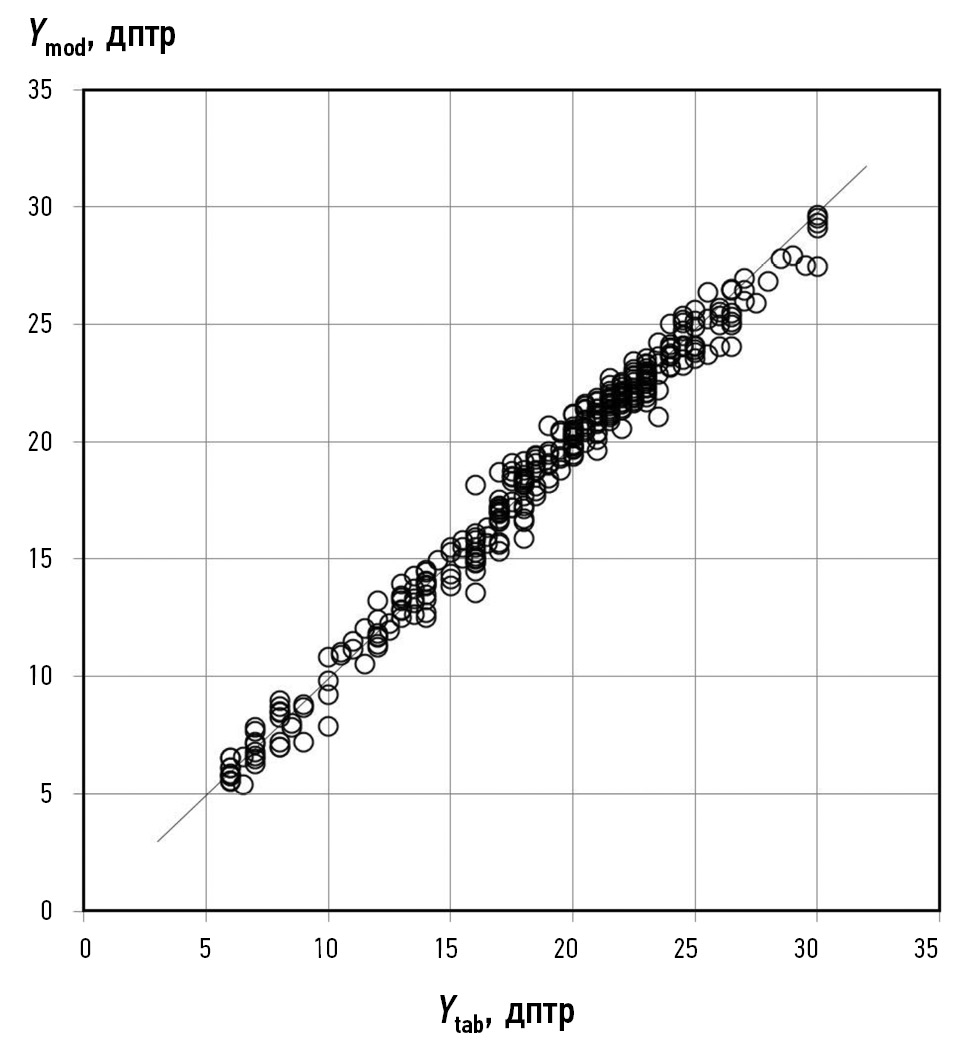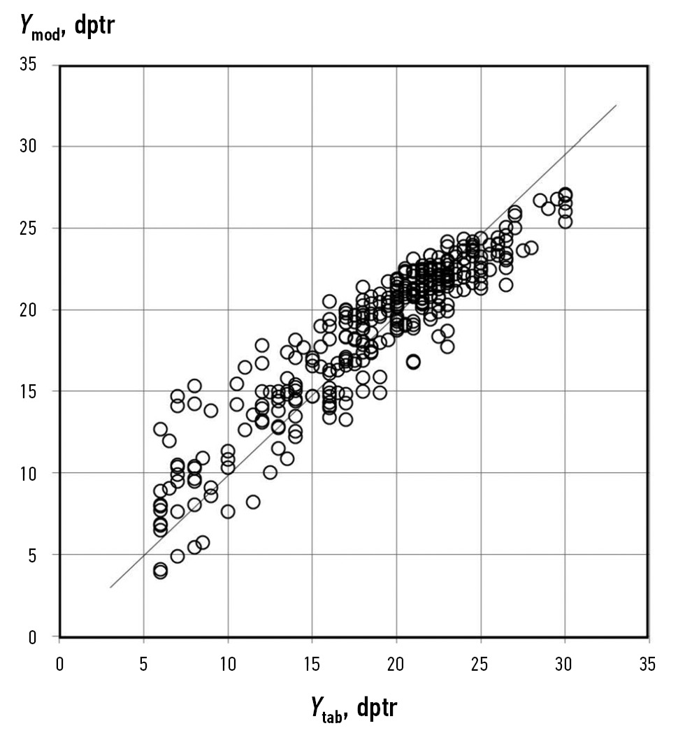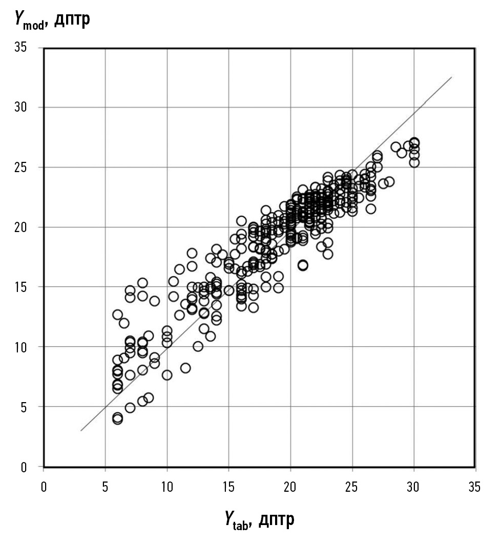 As shown in Fig. 1a, 1b, and 1d, a significant divergence is present in the slope angle of the dependence relative to the diagonal corresponding to the exact calculations. All the investigated formulas use three parameters as input values: eye length in mm (L), arithmetic mean of the meridians in mm (K), and anterior chamber depth as a lens parameter. This circumstance inevitably suggests the presence of other factors (possibly unobserved), and their effects on the optical IOL power led to the listed features of the calculation.
