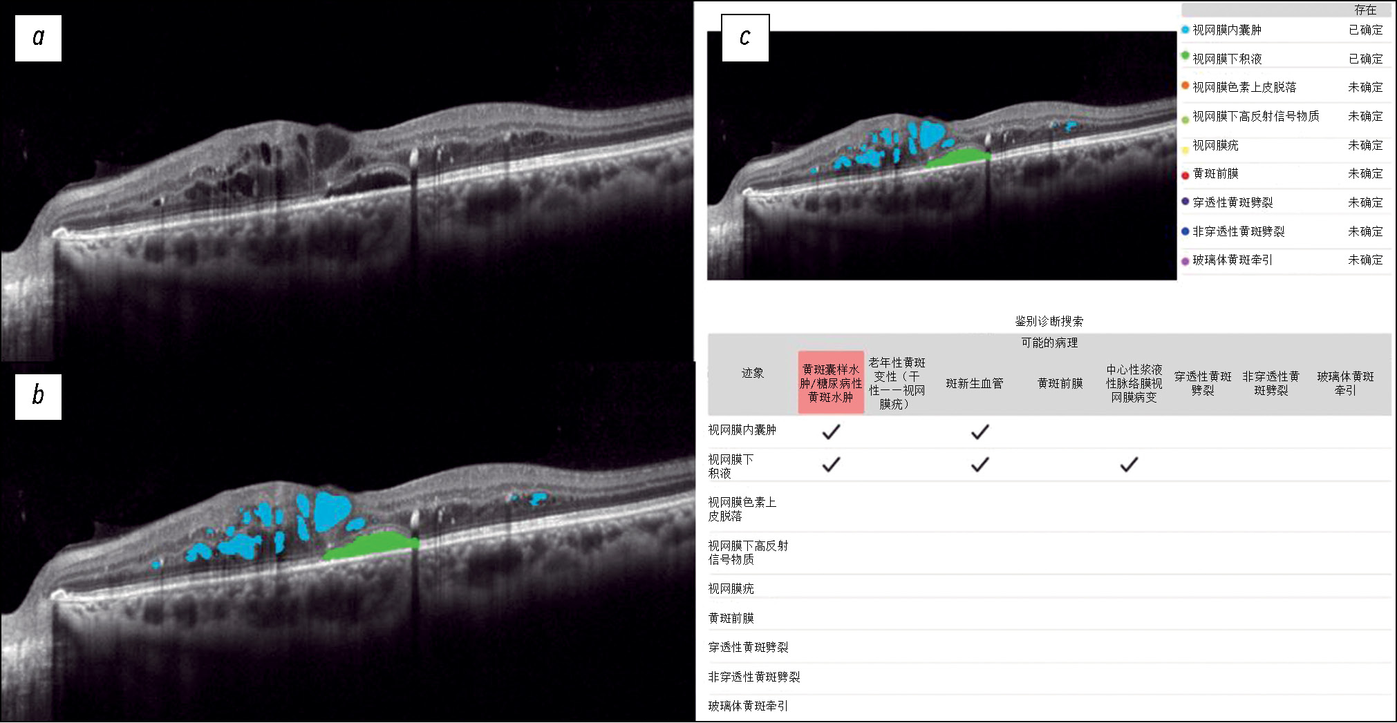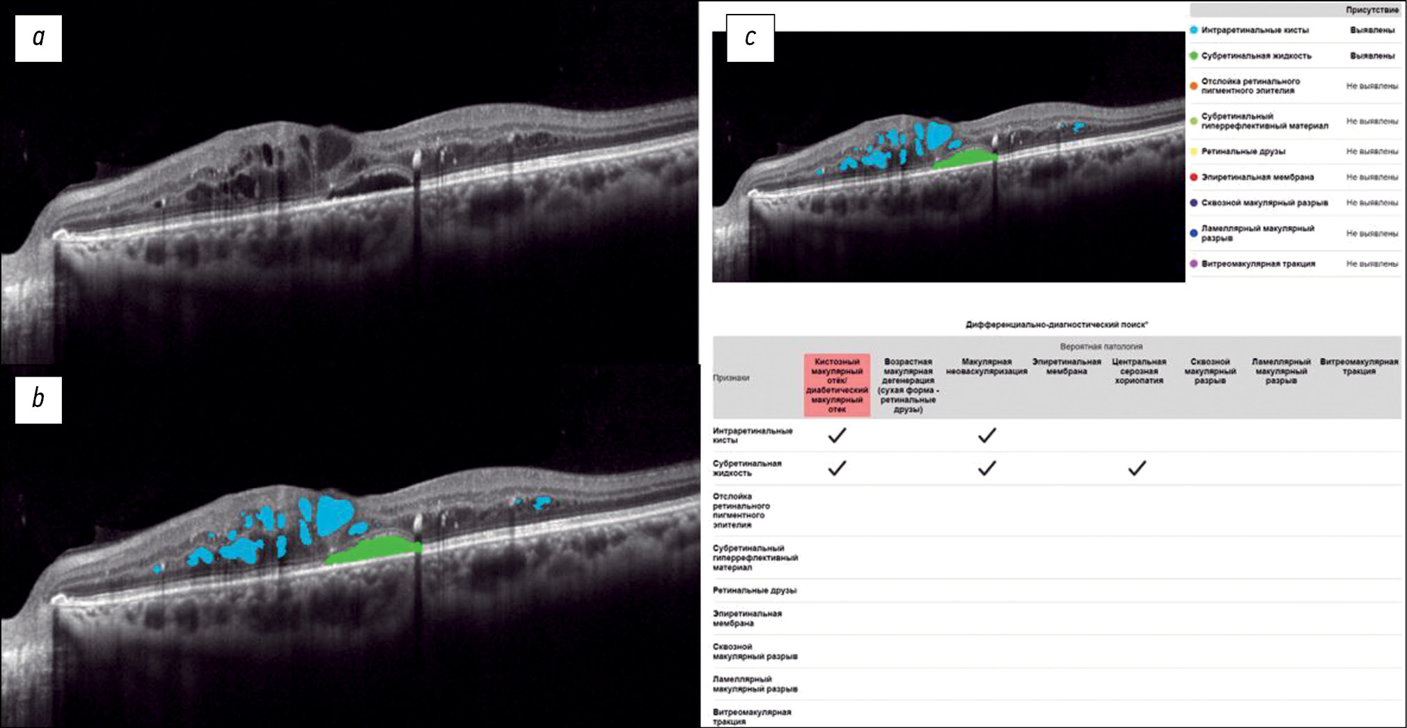 Fig. 1. An example of the optical coherence tomography scan analysis of a patient with diabetic macular edema by the artificial intelligence algorithm: a — structural optical coherence tomography scan; b — optical coherence tomography scan after segmentation of the pathological features (subretinal fluid — green mask, intraretinal cysts — blue masks); c — scan analysis report (the reporting table of the differential diagnostic search, probable pathology is highlighted in red — macular edema).