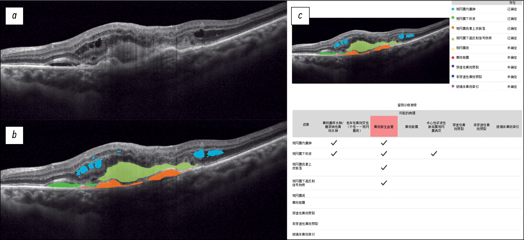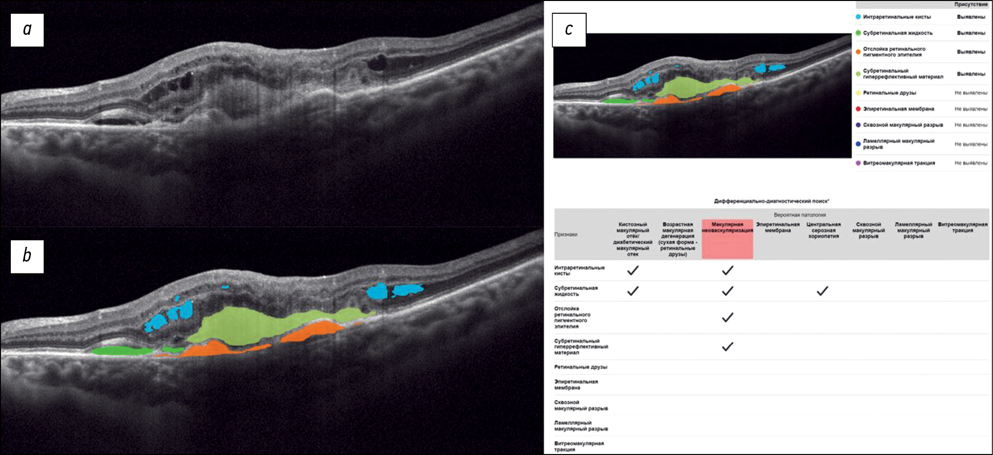 Fig. 2. An example of the optical coherence tomography scan analysis of a patient with exudative age-related macular degeneration by the artificial intelligence algorithm: a — structural optical coherence tomography scan; b — optical coherence tomography scan after segmentation of the pathological features (subretinal fluid — green mask, intraretinal cysts — blue masks, retinal pigment epithelium detachment — orange mask, subretinal hyperreflective material — yellow mask); c — scan analysis report (the reporting table of the differential diagnostic search, probable pathology is highlighted in red — macular neovascularization).