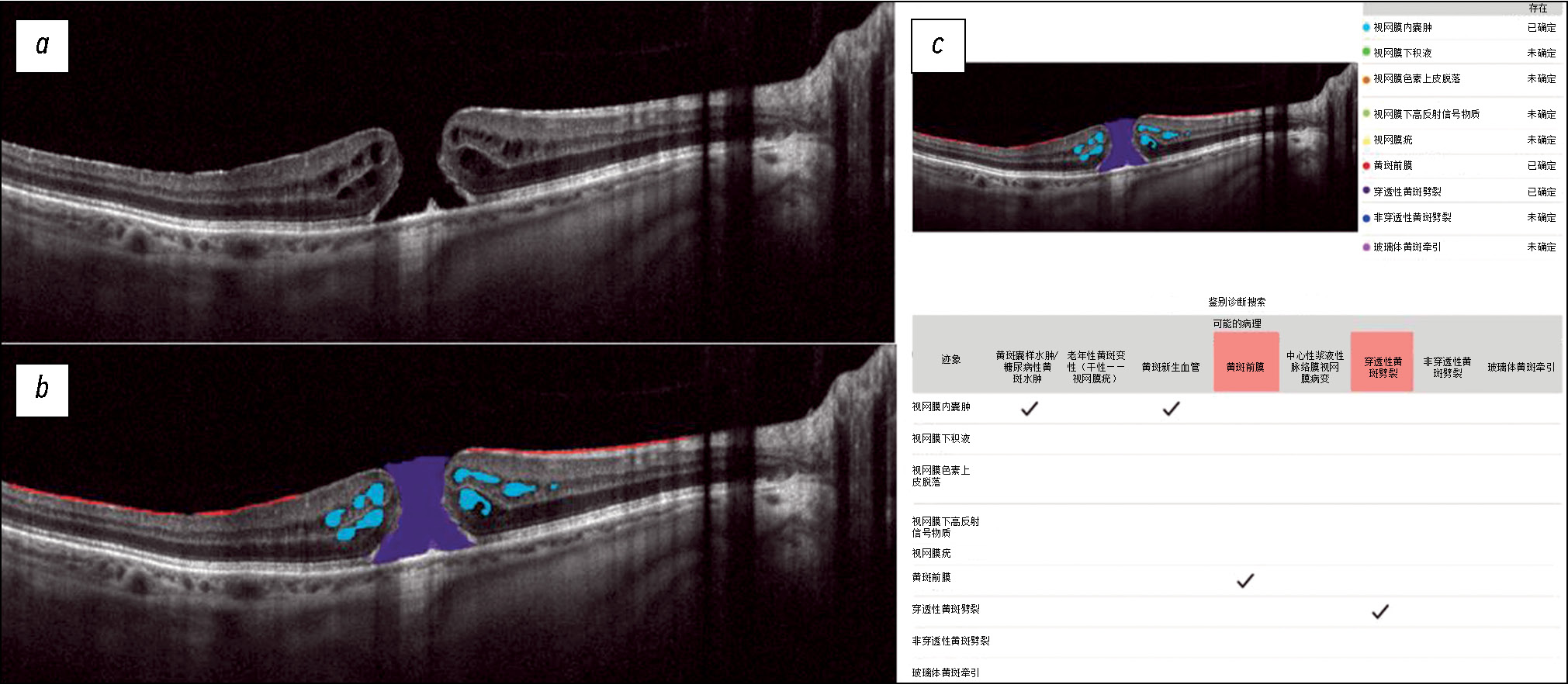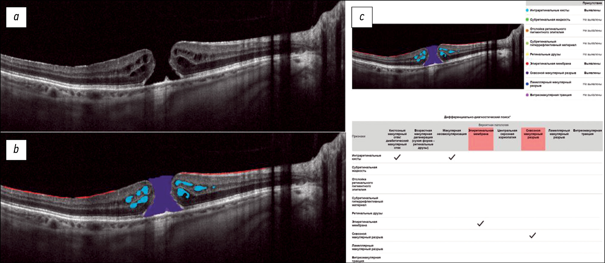 Fig. 3. An example of the optical coherence tomography scan analysis of a patient with macular hole, epiretinal membrane by the artificial intelligence algorithm: a — structural optical coherence tomography scan; b — optical coherence tomography scan after segmentation of the pathological features (macular hole — violet mask, intraretinal cysts — blue masks, epiretinal membrane — red masks); c — scan analysis report (the reporting table of the differential diagnostic search, probable pathology is highlighted in red — macular hole, epiretinal membrane).