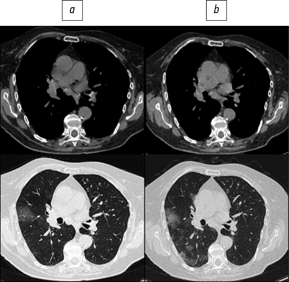 Fig. 2. Patient, 72 years old: standard computed tomography at admission was performed with radiation exposure of 2.1 mSv (a), low-dose computed tomography - 0.87 mSv (b).