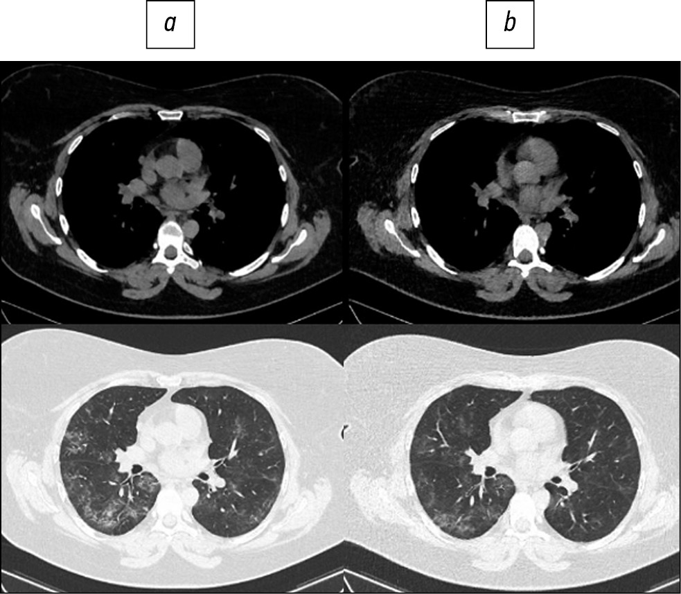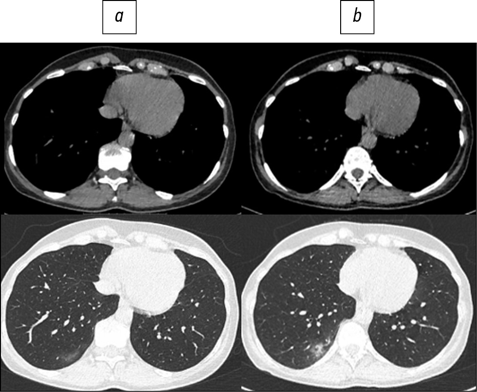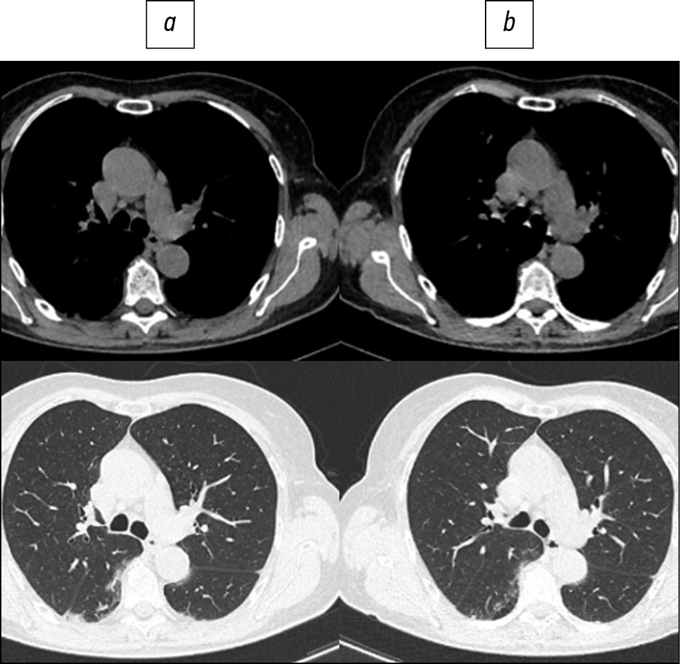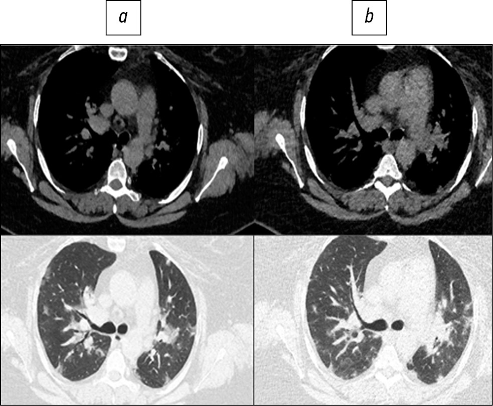 Here are illustrative examples of clinical cases (Figs. 1–6), demonstrating the similarity of diagnostic value of two aforementioned research methods. Columns on the left (a) show images of a standard CT scan performed upon admission of the patient to the hospital, and columns on the right (b) present LDCT over time. The top line of images indicates the pulmonary window mode, whereas the bottom line indicates the mediastinal window mode. For comparison, values of radiation exposure in each case are presented. Time intervals between standard CT and LDCT were 2–7 days; thus, the primary endpoint was reached in all patients enrolled in the study.