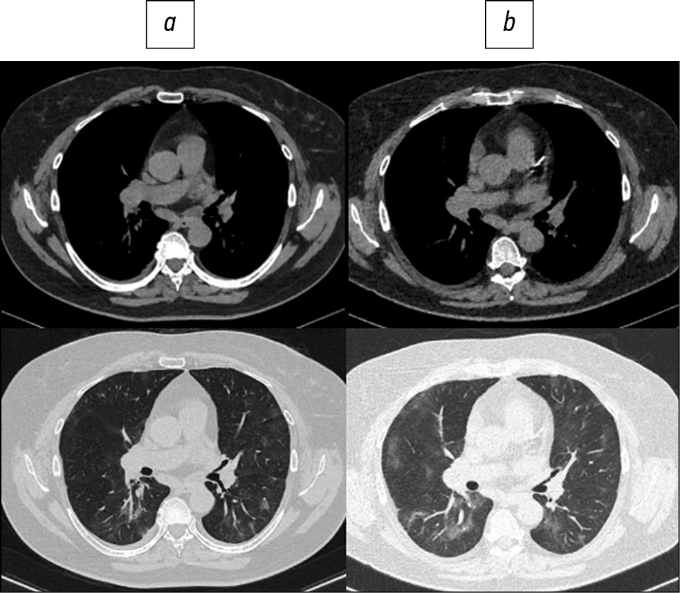 Fig. 4. Patient, 46 years old: standard computed tomography at admission was performed with a radiation dose of 5.6 mSv (a), low-dose computed tomography - 1.7 mSv (b).