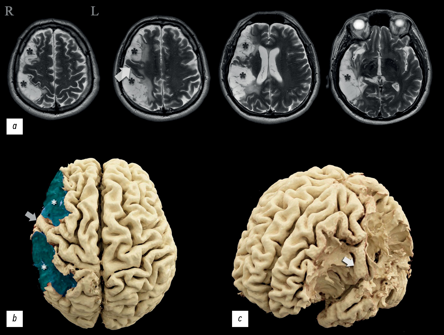 По результатам исследования были выявлены обширные зоны энцефаломаляции (рис. 1, *) в лобной, теменной и височной долях правого полушария, соответствующие бассейну правой средней мозговой артерии (СМА). На этом фоне отмечалась сохранность верхней лобной, медиальных отделов средней лобной и частично нижней лобной, прецентральной извилин (рис. 1, стрелка), с неполным сохранением передних отделов нижней, средней и верхней височных извилин; с субтотальным поражением ипсилатеральных теменной и височных долей, постцентральной извилины. Базальные ядра и кора островка, по данным МРТ, оказались интактны. По краю зоны энцефаломаляции отмечались признаки отложения гемосидерина. Визуализируемый правый желудочек был расширен за счёт отрицательного объёмного эффекта зоны кистозно-глиозных изменений.