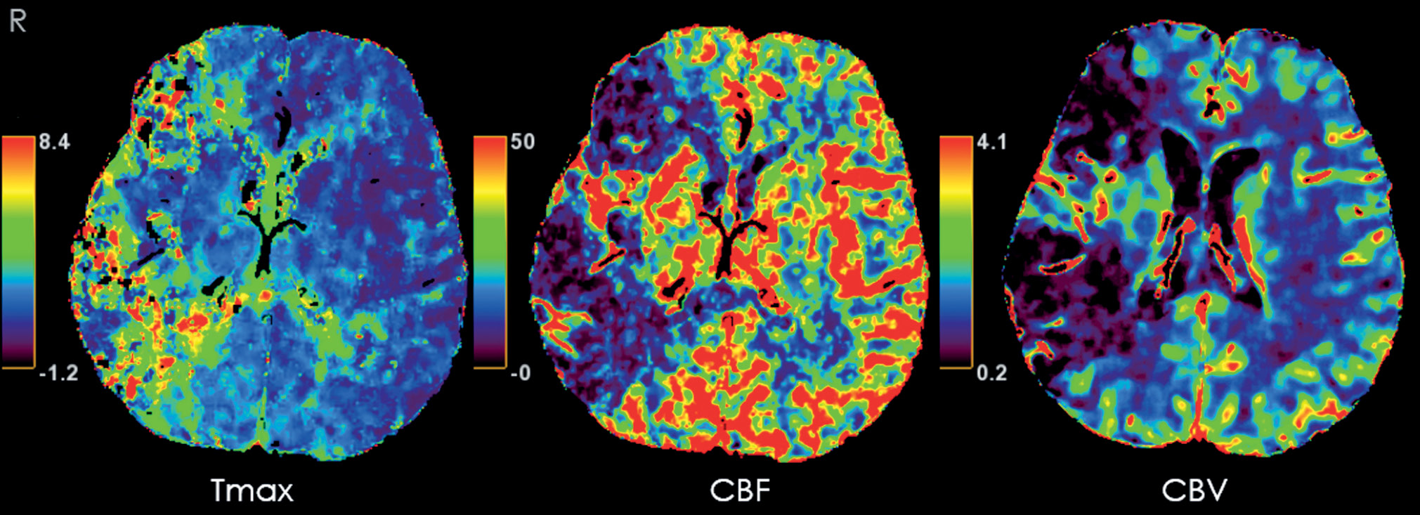 Рис. 2. Карты перфузии в аксиальной плоскости на уровне поражения, по данным компьютерной томографии. Отмечается снижение перфузии, характерное для постинфарктных изменений, в зонах, соответствующих кистозно-глиозной перестройке: Tmax (время до максимума функции вычета, с); CBF (скорость кровотока, мл/100 г×мин); CBV (объём кровотока, мл/100 г).