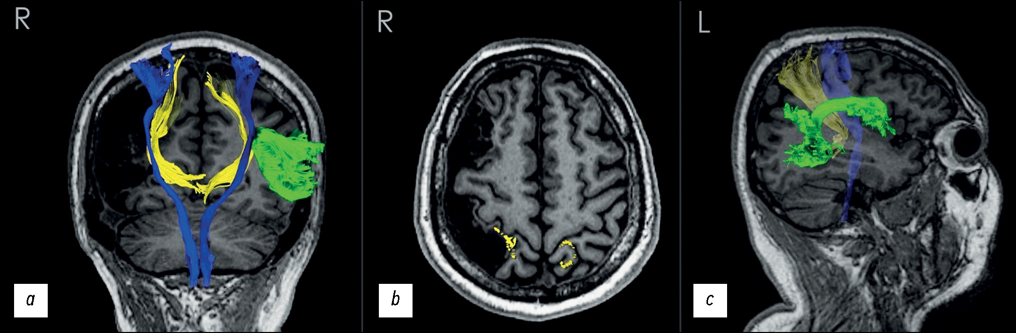 Рис. 3. Реконструированные данные магнитно-резонансной трактографии, наложенные на магнитно-резонансные томограммы, Т1-взвешенные изображения во фронтальной плоскости: а — кортикоспинальные тракты (синий), дугообразный пучок (салатовый), пути медиальных петель (жёлтый); b — проекции пучков пути медиальных петель (жёлтый) в области постцентральных извилин; c — описанные тракты в сагиттальной плоскости (вид со стороны левого полушария с полупрозрачным срезом).