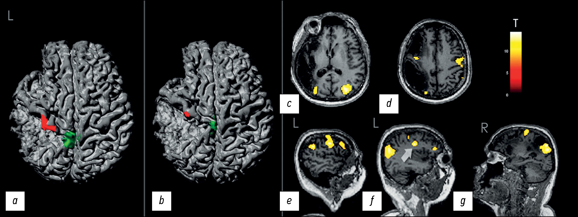 Рис. 4. a, b — трёхмерные реконструкции данных функциональной магнитно-резонансной томографии: a — при движении пальцами левой кисти и левой стопой; b — при тактильном раздражении левой кисти и левой стопы; красный цвет соответствует кисти, зелёный — стопе. c, d, e, f, g — магнитно-резонансные томограммы с данными функциональной магнитно-резонансной томографии о локализации зон активации во время устного счёта без произношения вслух в аксиальной плоскости (c, d), сагиттальной плоскости с визуализацией левого (e, f) и правого (g) полушарий. Стрелкой указано возможное пересечение с зоной Брока.