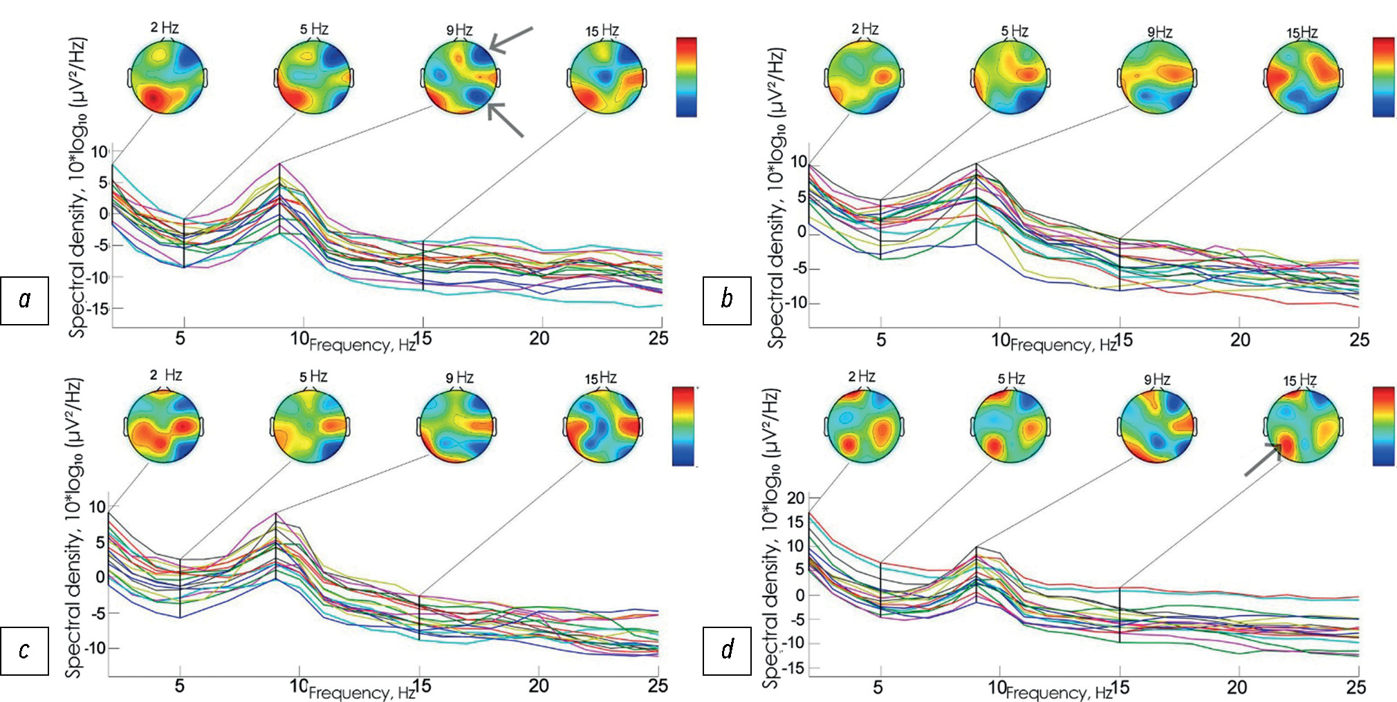 Рис. 5. Амплитудно-частотные характеристики биоэлектрической активности пациента: а — в состоянии расслабленного бодрствования (в правом полушарии регистрируются зоны десинхронизации, соответствующие по локализации участкам энцефаломаляции — указаны стрелками); b — при движении руками; c — при прослушивании короткого рассказа; d — при пересказе короткого рассказа (активация коры в левых задневисочных отведениях — указана стрелкой).
