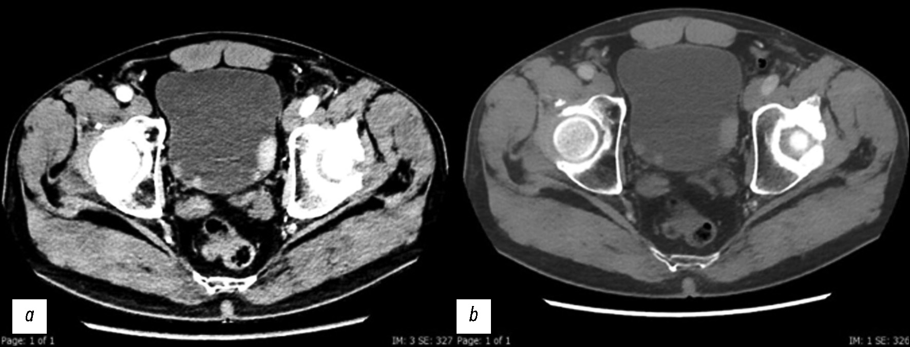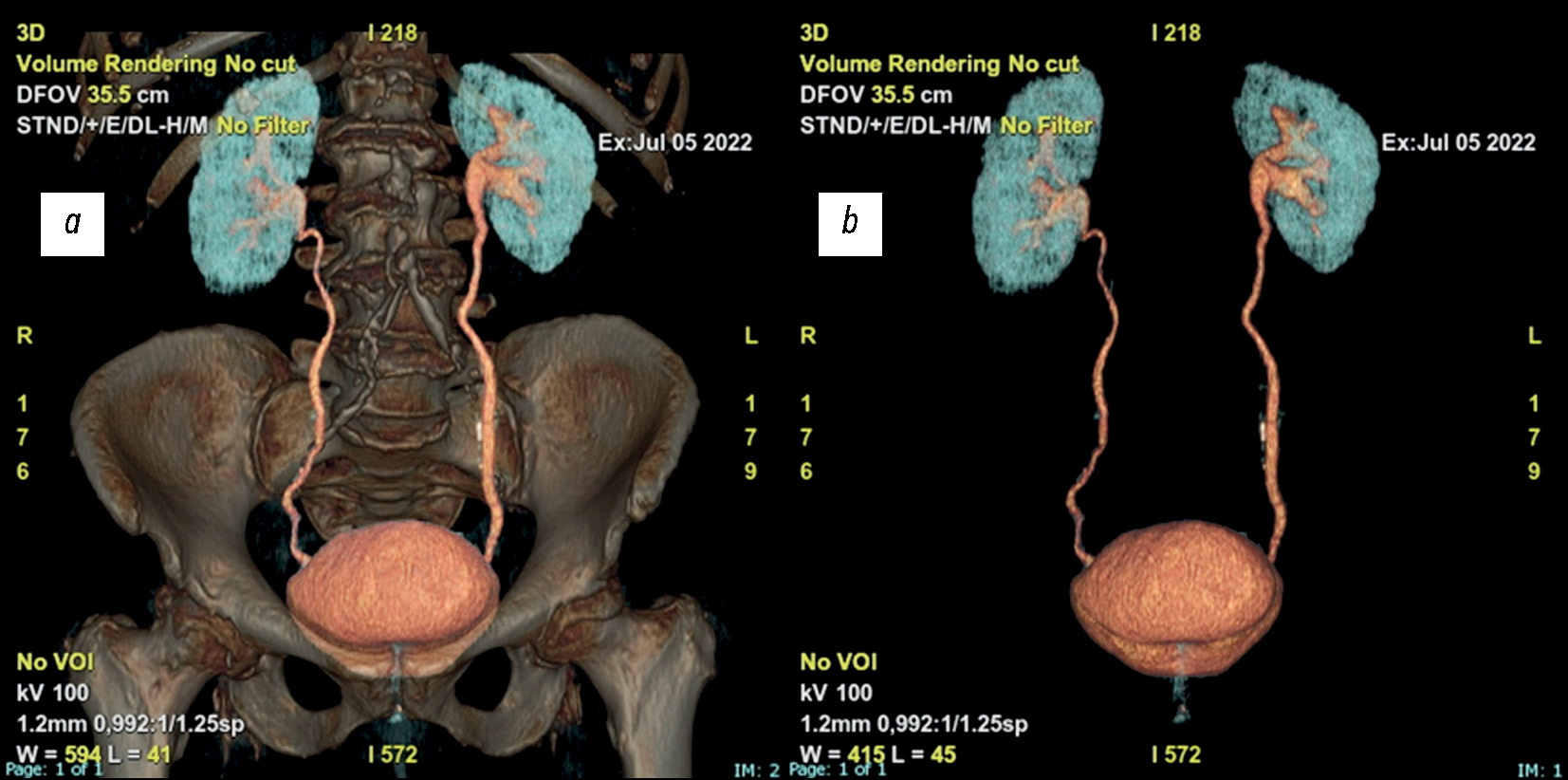 Использовали многофазный протокол сбора данных. На первом этапе выполнили исследование брюшной полости и малого таза без контрастирования. Затем пациентам внутривенно ввели фуросемид для более качественной визуализации чашечно-лоханочной системы и мочеточников, а также для более равномерного контрастирования мочевого пузыря.