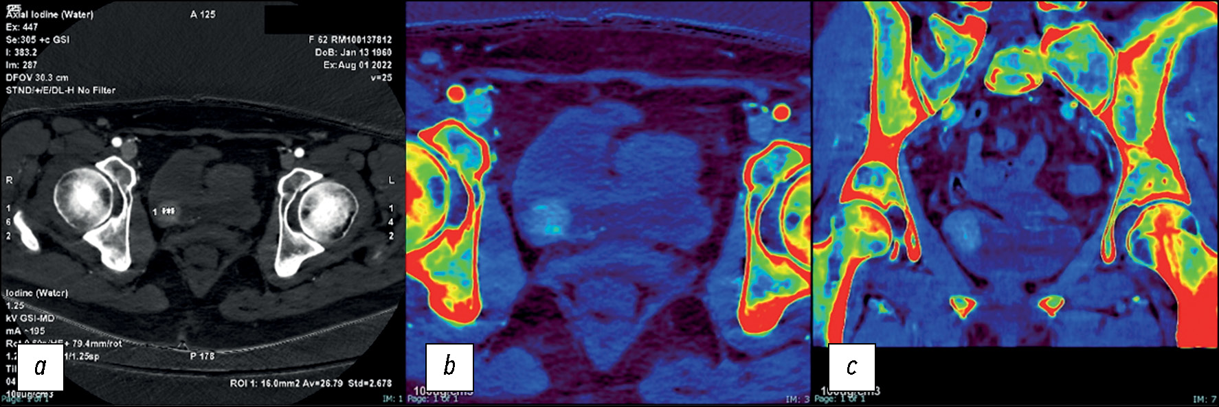 Рис. 6. Пациент с гематурией на фоне антикоагулянтной терапии, с подозрением на тромб: a — йодная карта в аксиальной плоскости, полученная в артериальную фазу (Av=26,79 соответствует концентрации йода в мг/мл при пороговом значении 1,3 мг/мл). Согласно данным компьютерной томографии, очаг содержит йод, поэтому есть все основания подозревать в нём новообразования мочевого пузыря; b — йодная карта с наложением цвета, полученная в артериальную фазу компьютерной томографии в аксиальной плоскости, содержание гидроксиапатита не выявлено; c — йодная карта с наложением цвета, полученная в артериальную фазу компьютерной томографии в коронарной плоскости, содержание гидроксиапатита не выявлено.