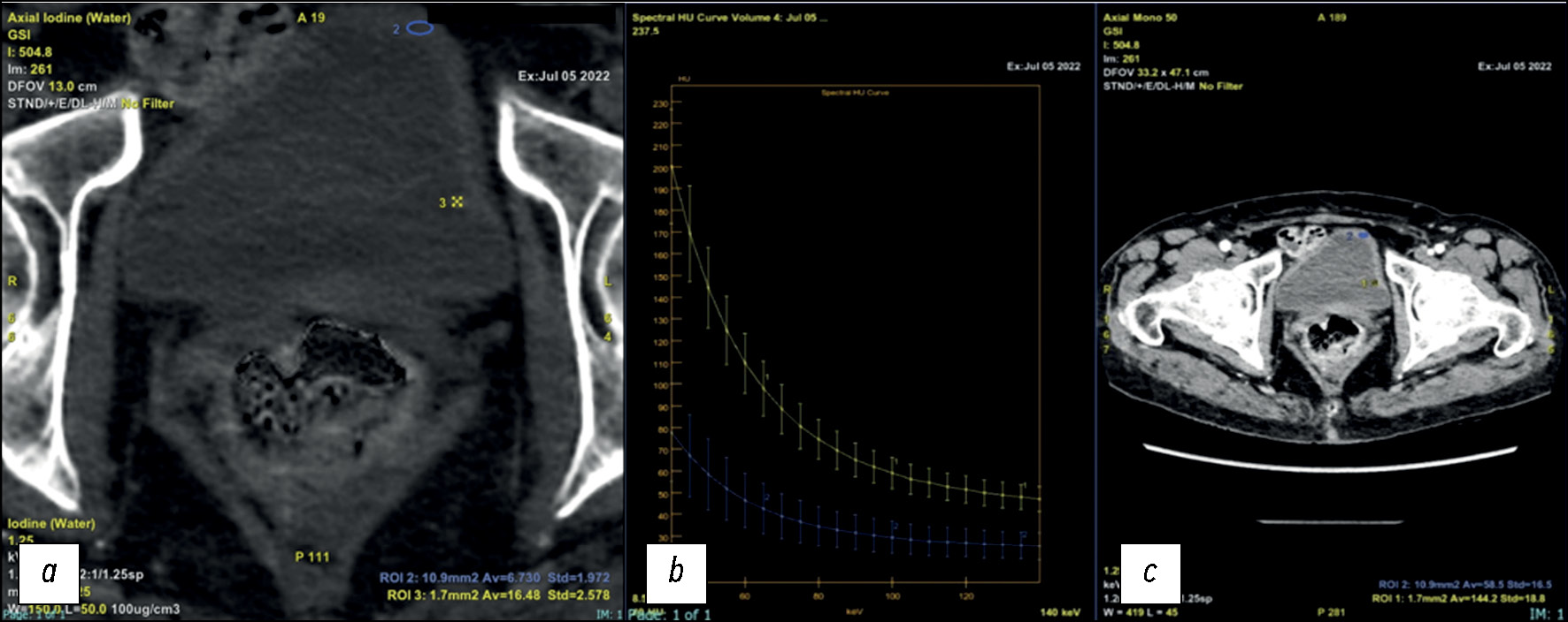 Рис. 7. Пациент с гематурией с подозрением на опухолевый очаг в мочевом пузыре: a — при проведении компьютерной томографии в аксиальной плоскости наблюдается умеренное утолщение стенки мочевого пузыря со значительной концентрацией йода, что с высокой вероятностью указывает на присутствие очага. AV отражает концентрацию йода в мг/мл, которая составляет 6,7 и 16,48 мг/мл для участков, отмеченных синим кругом и выделенных жёлтым (пороговое значение 1,3 мг/мл) соответственно; b, c — спектральная кривая, которая позволяет описать материалы по различиям в кривой затухания.