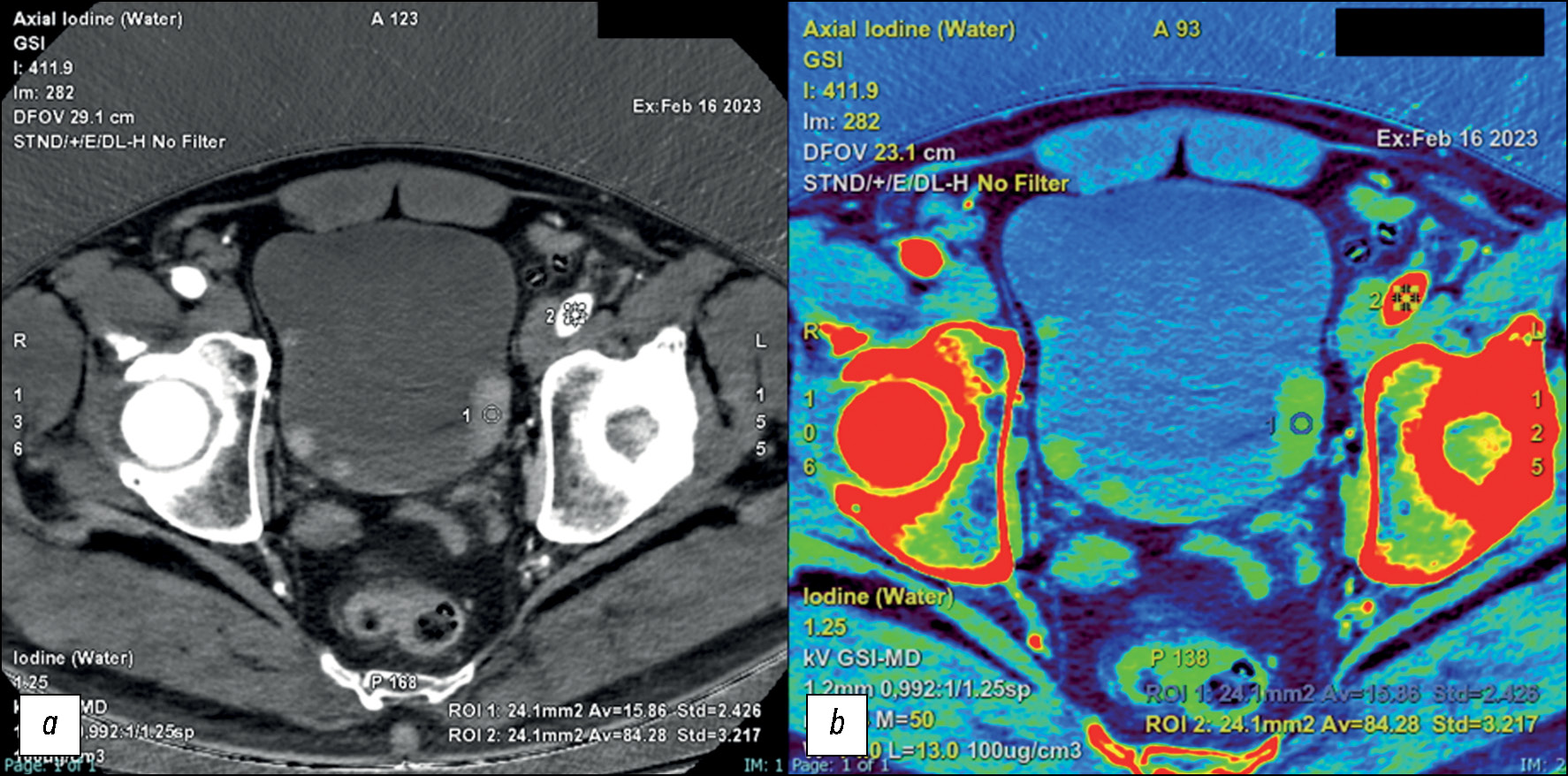 Рис. 8. Компьютерная томография в нефрографической фазе. Её целесообразно использовать для количественной оценки концентрации йода и её нормализации по содержанию йода в аорте: a — йодная карта с демонстрацией нескольких твёрдых узелков на стенке мочевого пузыря; b — йодная карта с наложением цвета для более качественной визуализации очагов. Среднее значение на очаг составляет 1,5 мг/мл, значение Av подвздошной артерии — 8,4 мг/мл, а пороговое значение — 1,3 мг/мл.