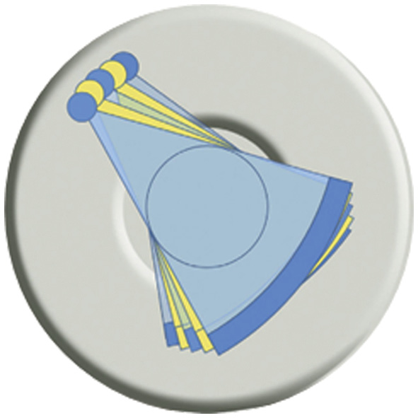 Схема ДЭКТ с одним источником рентгеновского излучения данного типа. Жёлтым отмечен спектр низкой энергии, голубым — спектр высокой энергии. Детектор может быстро регистрировать информацию при воздействии двух уровней энергии | |