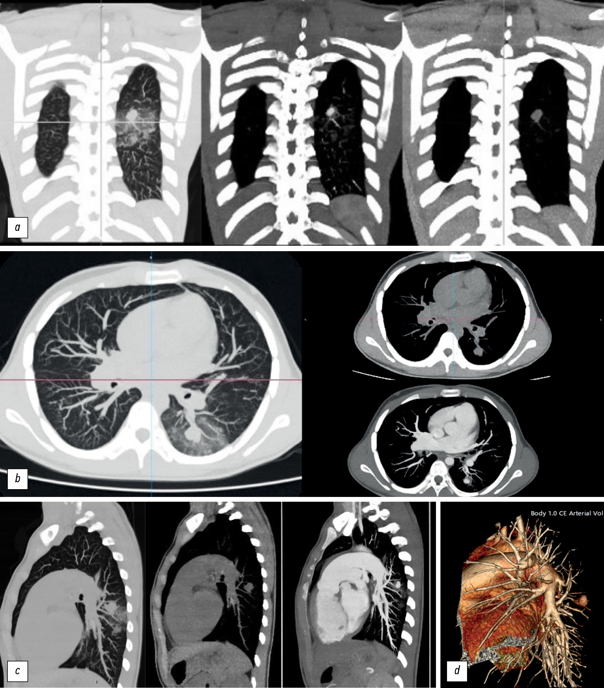Рис. 2. Наблюдение в режиме лёгочного окна и мягких тканей поражение в VΙ сегменте левого лёгкого округло-овальной формы, размером 1,6×1,4×1,2 см, плотностью до 27 единиц Хаунсфилда на фоне инфильтративных изменений, свидетельствующее о внутрипаренхиматозном кровоизлиянии: a — снимок во фронтальной плоскости, b — снимок в аксиальной плоскости; c — снимок в сагиттальной плоскости; d — аневризма сегментарной ветви лёгочной артерии, показанная с помощью 3D-реконструкции.