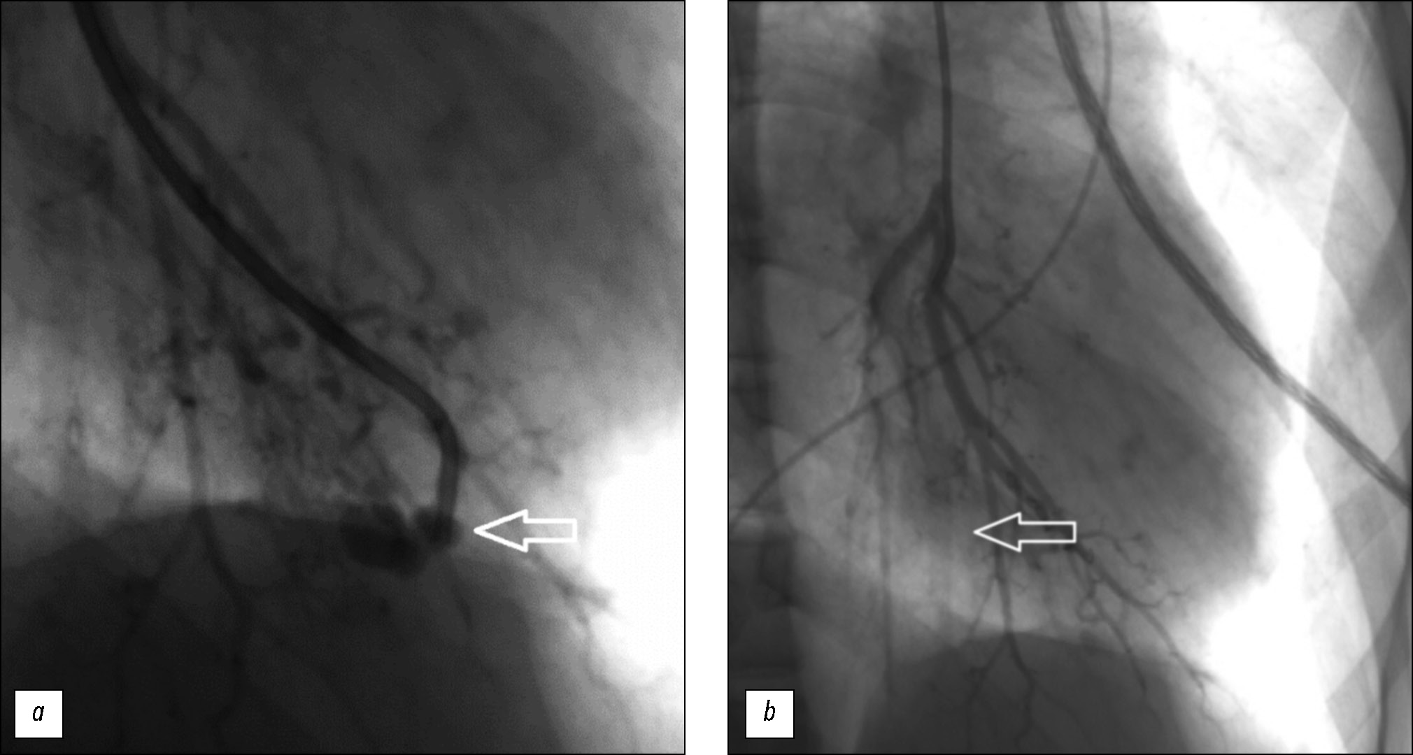 Рис. 3. Ангиография: a — ангиографический снимок в переднезадней проекции, в терминальной ветви VΙ сегмента обнаружено аневризматическое расширение размером 4,0×5,0 мм (обозначено белой стрелкой); b — контрольная ангиография в переднезадней проекции, эмболизационную спираль ввели через установленный катетер (обозначена белой стрелкой).