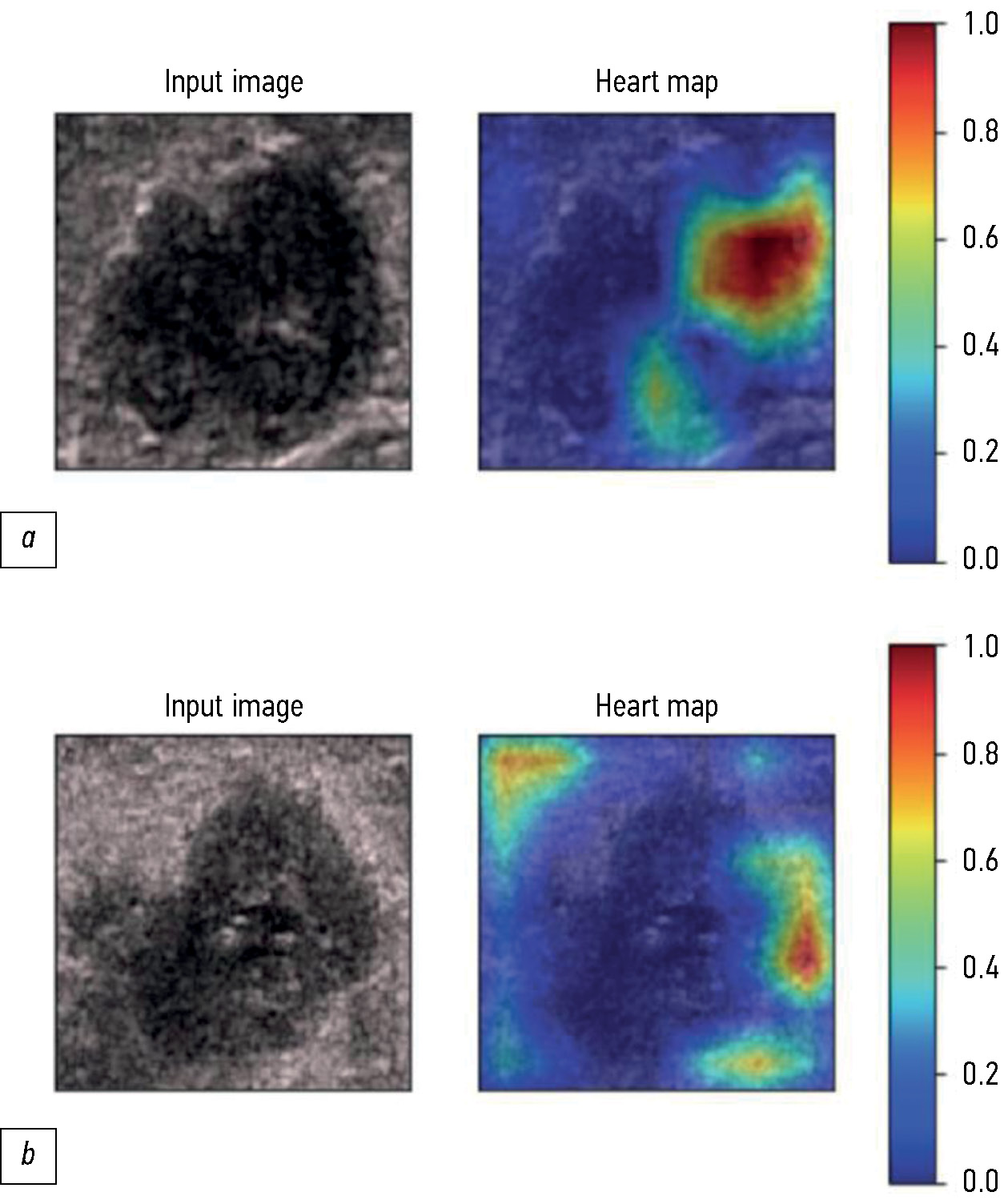 В исследовании X. Zheng и соавт. [14] проводились измерения при помощи УЗИ с использованием свёрточной ИНС для идентификации ранней стадии рака молочной железы. На рис. 2 показана визуализация двух примеров пациентов. Каждый пример показывает изображение ультразвукового сканирования в градациях серого и соответствующую карту сердца, красная область представляет собой больший вес, который можно расшифровать с помощью цветовой шкалы справа. Рис. 2, a показывает, что низкозвуковая область внутри опухоли ценна для предсказания статуса околососудистых лимфатических узлов, в то время как на рис. 2, b границей опухоли служит сама опухоль.