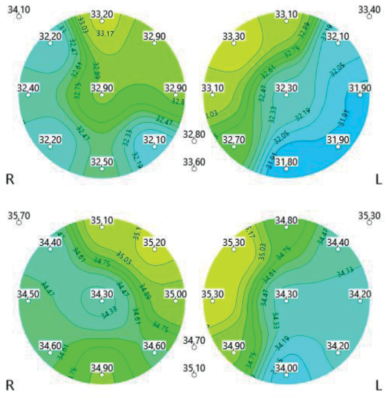 Помимо приведённых выше методов диагностики, существуют подходы, которые позволяют выявлять факторы риска и на этом основании предлагать более обстоятельное обследование [21–23]. Один из данных методов — микроволновая радиотермометрия с использованием компьютеризированного диагностического комплекса [21]. Этот комплекс разработан для измерения интенсивности естественного электромагнитного излучения, которое испускают внутренние ткани пациента в диапазоне сверхвысоких частот. Интенсивность излучения пропорциональна температуре тканей. Данный метод используется в онкологии, неврологии, урологии и гинекологии. Его главное преимущество в том, что он безопасен, не имеет противопоказаний и может быть использован при диагностике и контроле лечения различных заболеваний. На рис. 3 показан пример термограммы здорового пациента. Однако анализ и интерпретация термометрических данных является довольно сложной задачей [24].