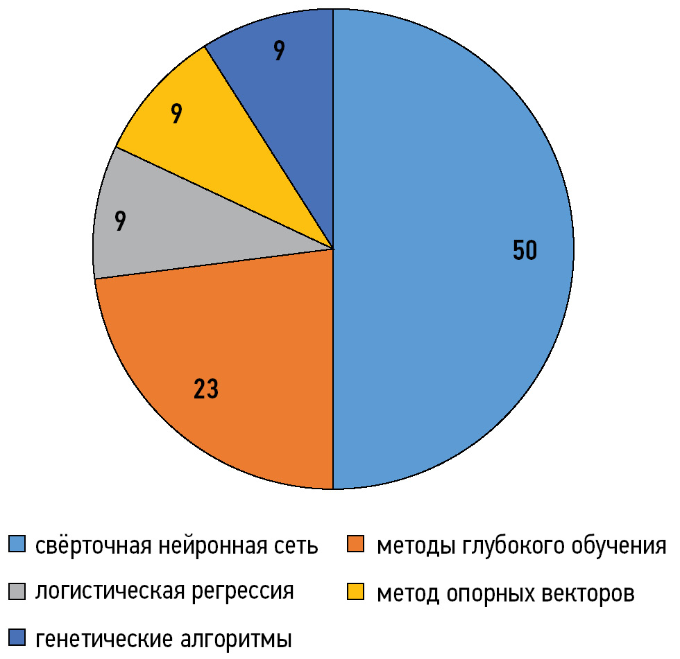В рамках данной работы было проанализировано более 200 научных публикаций из открытых источников. Использовались работы из различных стран: России, США, Китая, Ирака и др. На рис. 5 приведена диаграмма, в которой показывается, какие модели машинного обучения чаще используются при диагностике рака молочной железы.